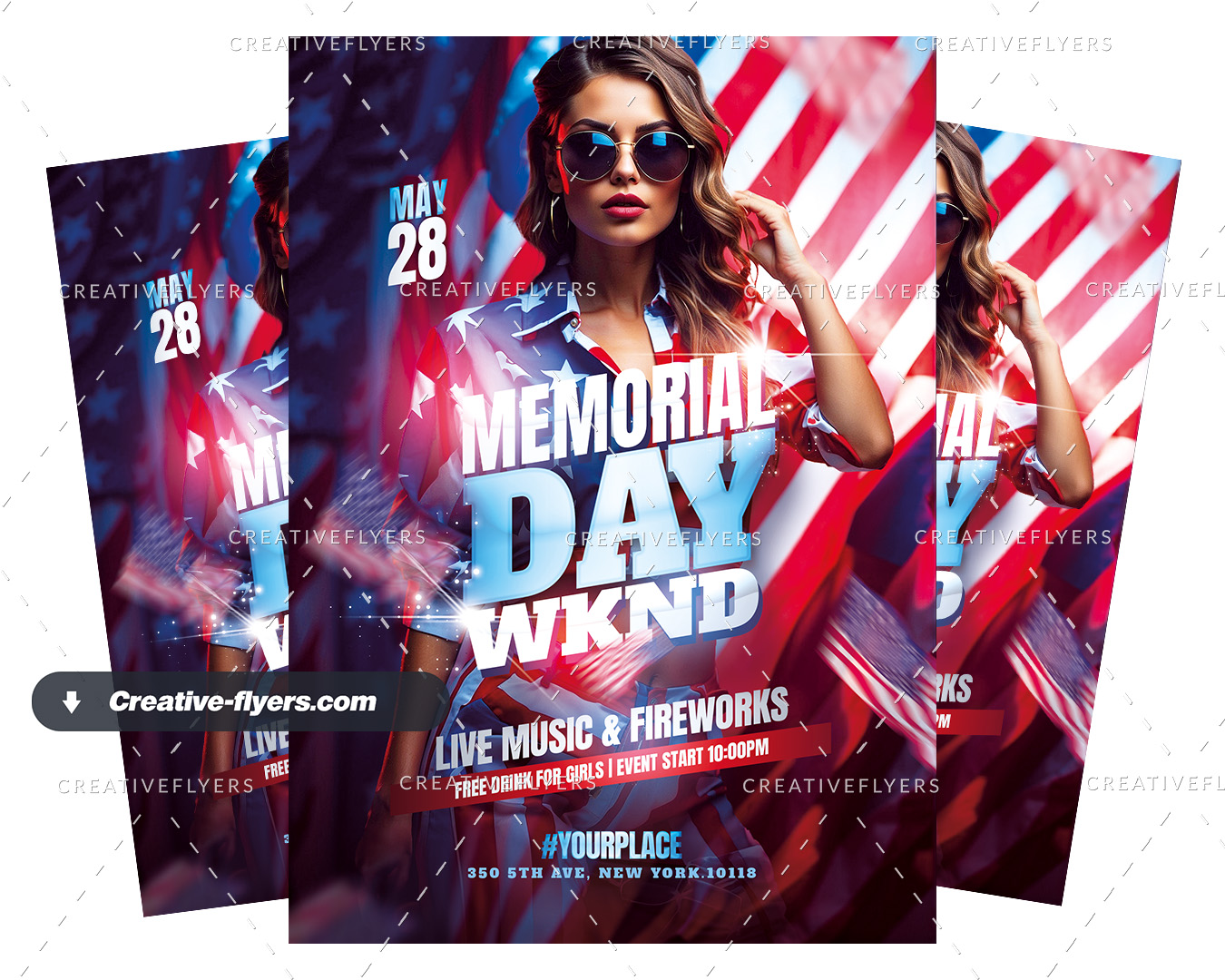 This design is all about energy and impact. With bold fonts, dynamic layouts, and a striking color scheme, it’s ideal for nightclubs, bars, or any high-energy Memorial Day event. Customize the text and images easily to fit your branding and event specifics.