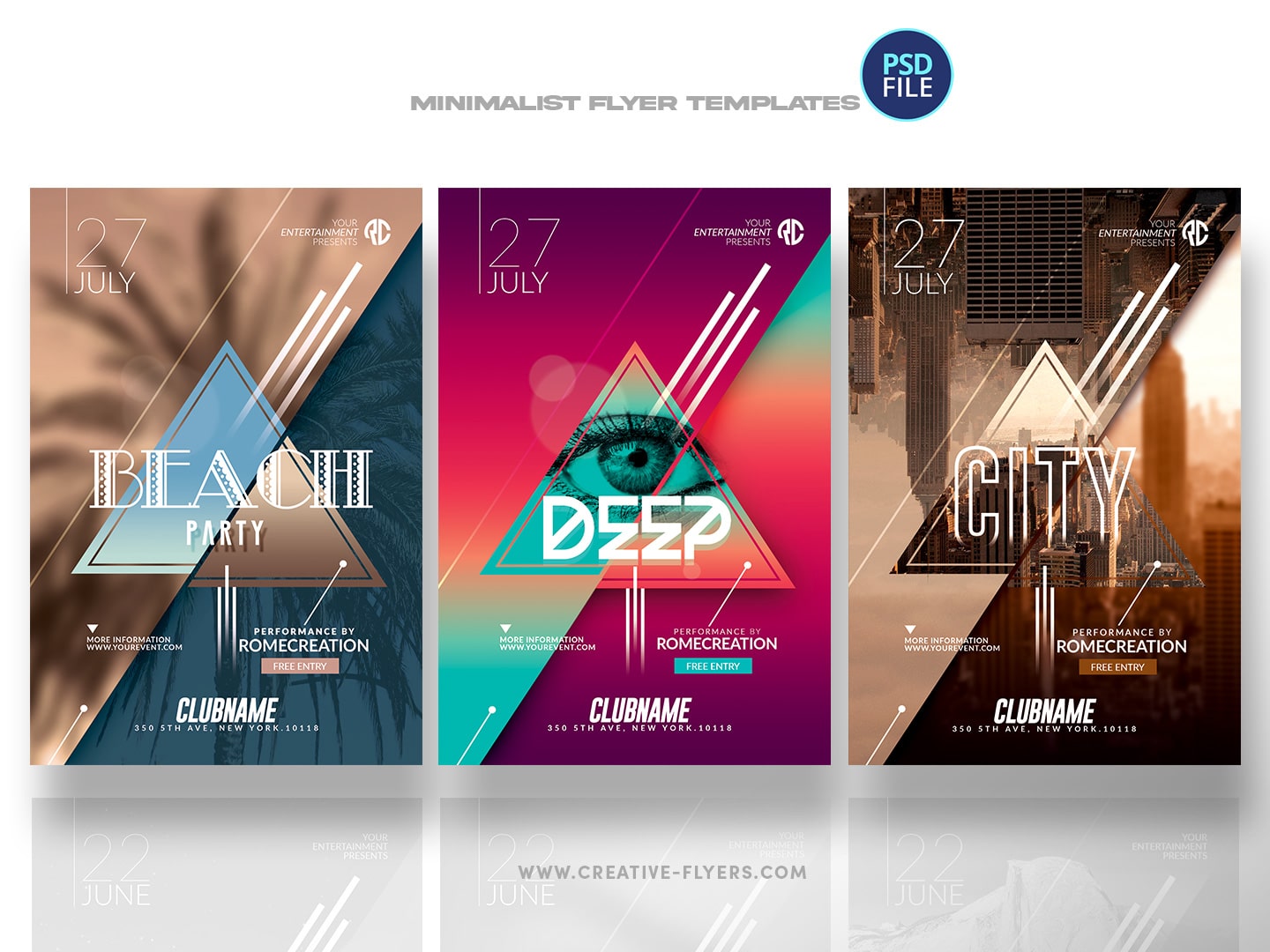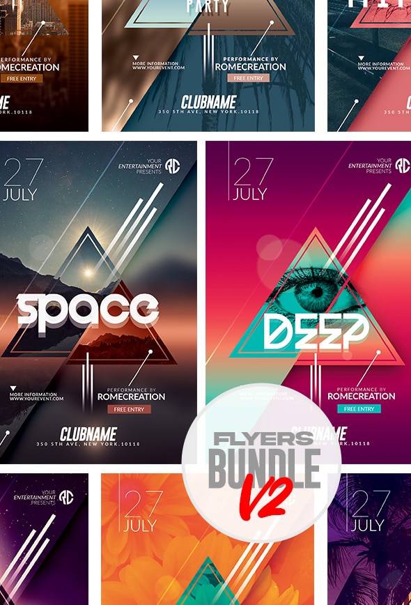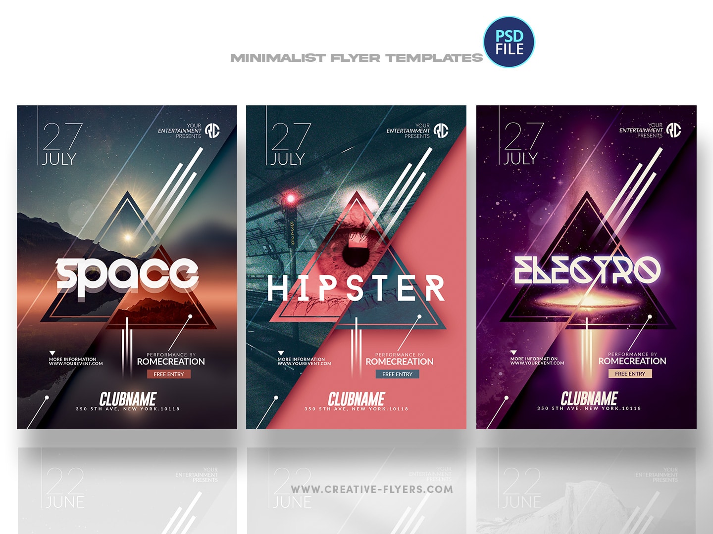 A minimalist and very eye-catching flyer package available for download! If you liked this style, take advantage of downloading this Photoshop package created with several themes (Hipster, beach party, electro events, space, summer, urban, spring, winter…), a top design from our graphic designer perfect for promoting your different events and parties in just a few clicks! You can use this PSD flyer template in your personal and commercial projects. All written texts can be edited, help file included, you will get font download links.