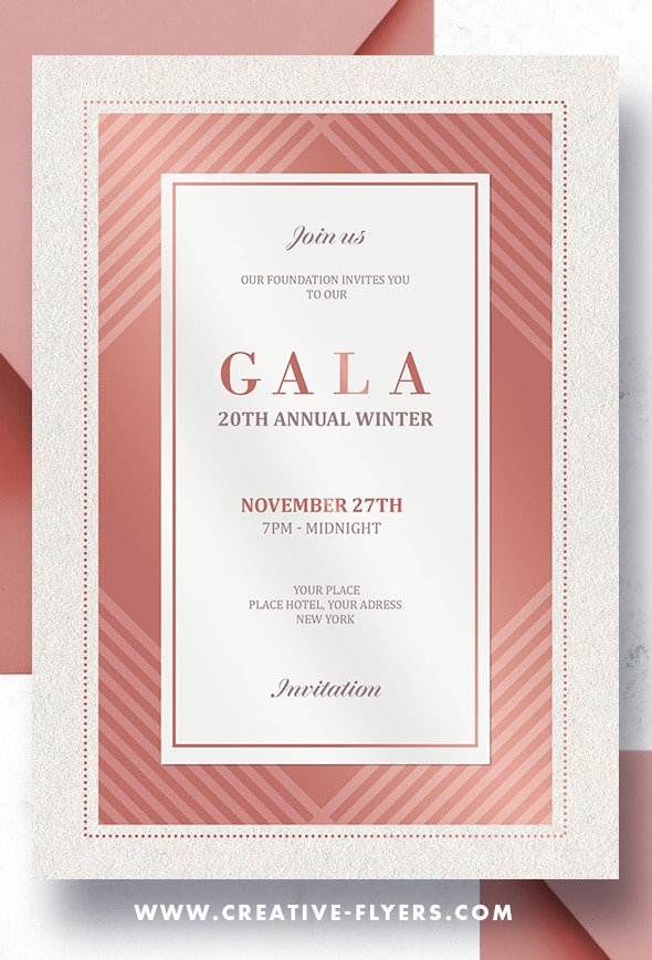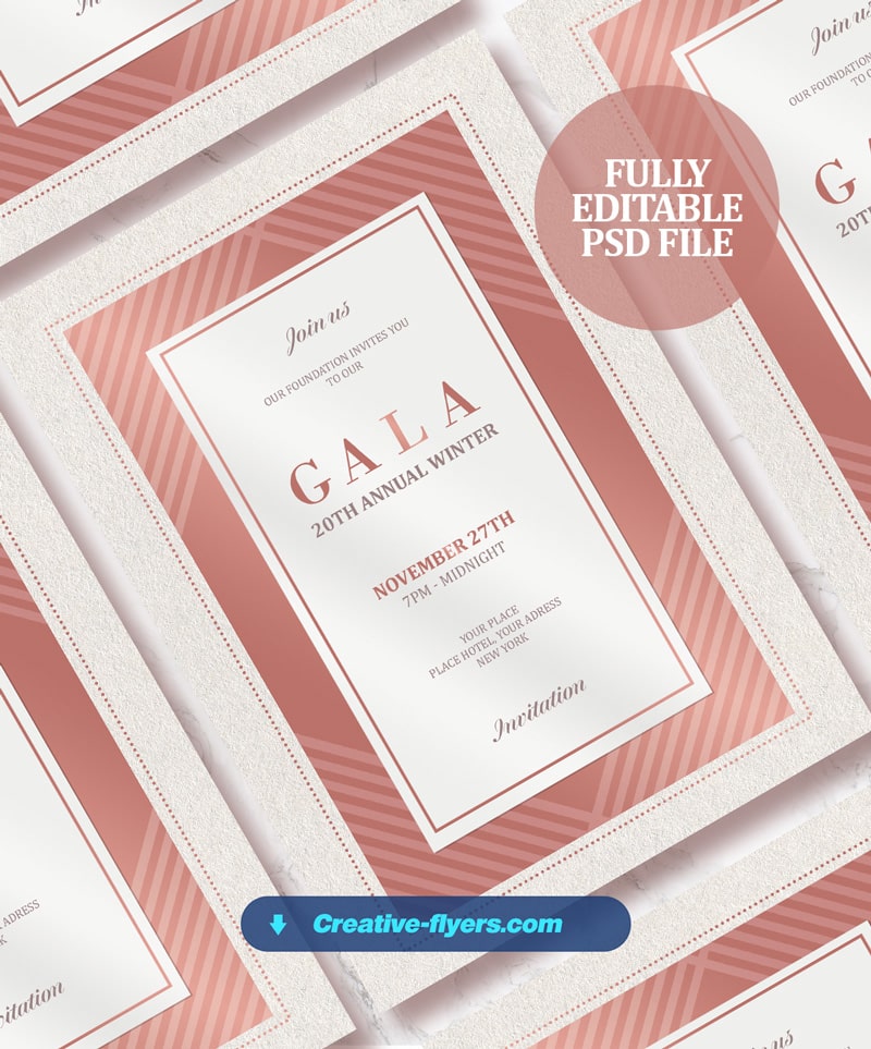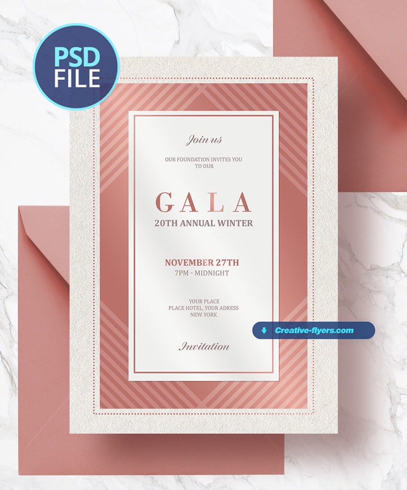Invite guests to your next gala or charity event with this gala invitation. Personalize your graphic with Photoshop, by adding your own text, you can even change colors in a few clicks… and your invitation will be ready to be printed.