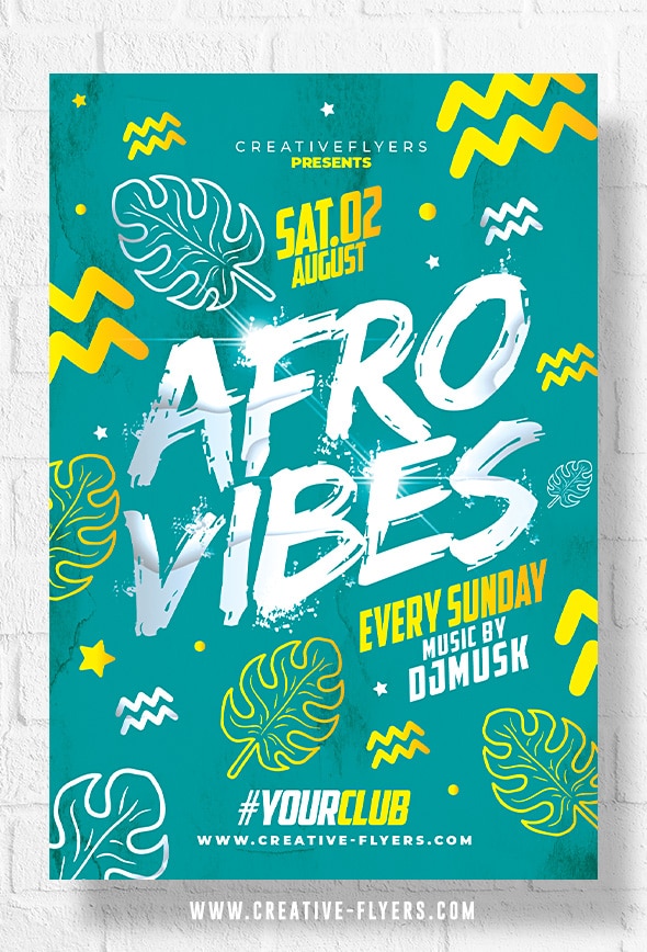 A graphic template to announce your musical evening, in a bar, a restaurant, in a club, reggaeton music theme or a Afrobeats music party on the beach. Afro style, colorful and impactful, enjoy downloading this Photoshop PSD template, a design made with photoshop by our graphic designers in our creativeflyers marketplace.