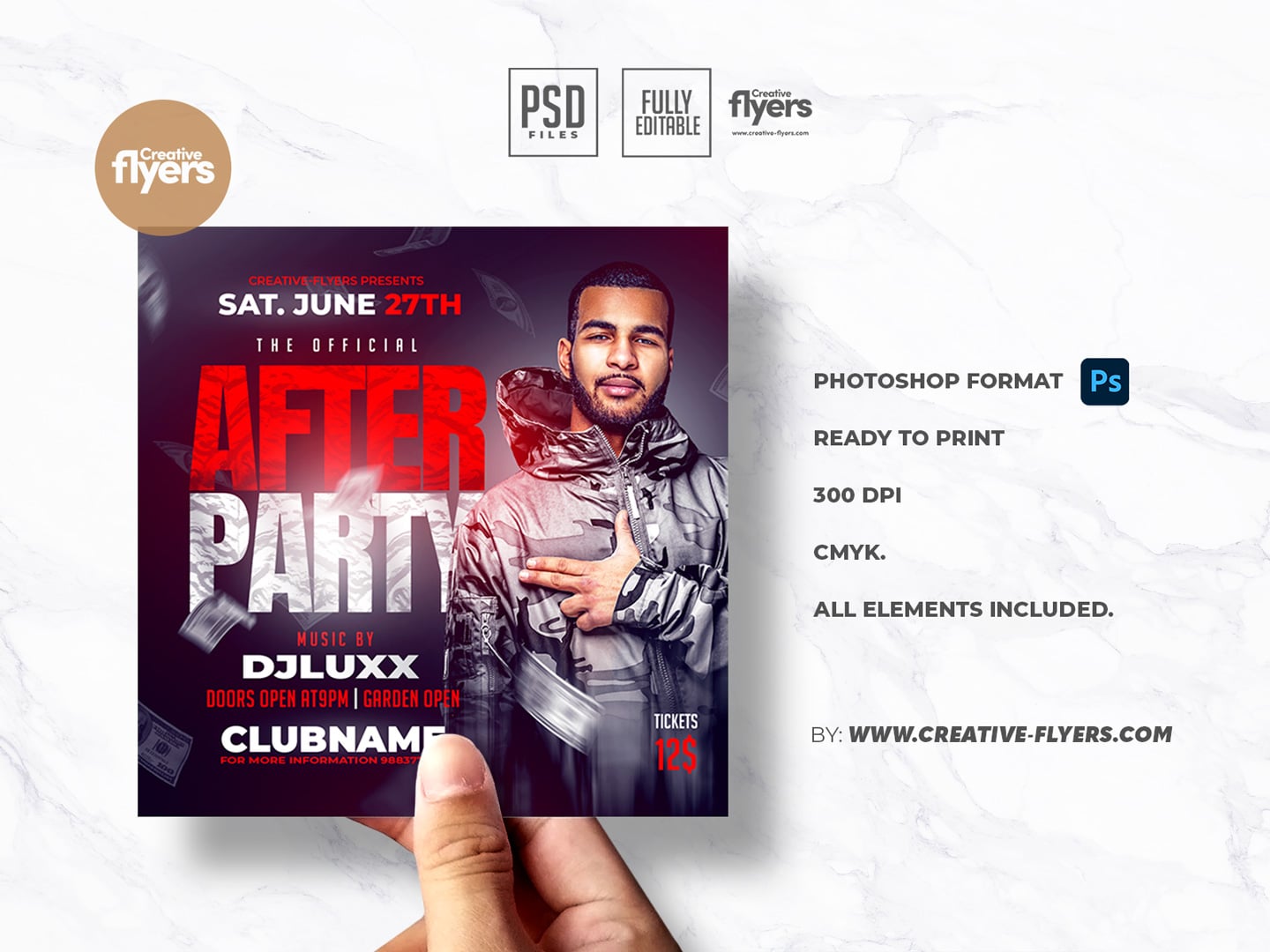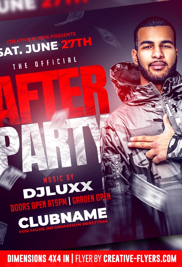 Announce an event with unique and professional quality flyers. Here is a model of flyer for an after party, in a club or a private evening of an artist, concert or others. Our flyer templates are a great alternative to save time and money. You can modify texts, colors, all elements are included in the download.