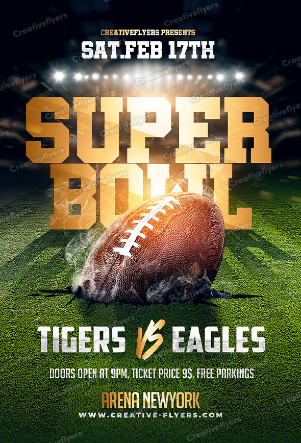 This Super Bowl flyer was designed to radiate excitement and intensity. The glowing stadium lights, dynamic shadows, and bold gold typography capture the thrill of game day. The smoky texture around the football adds realism and energy, creating a design that draws fans in instantly. Perfect for promoting sports events or viewing parties.