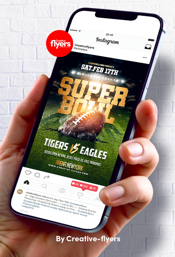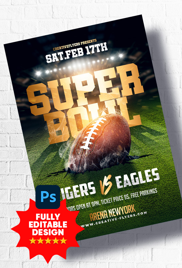 This Super Bowl flyer was designed to radiate excitement and intensity. The glowing stadium lights, dynamic shadows, and bold gold typography capture the thrill of game day. The smoky texture around the football adds realism and energy, creating a design that draws fans in instantly. Perfect for promoting sports events or viewing parties.