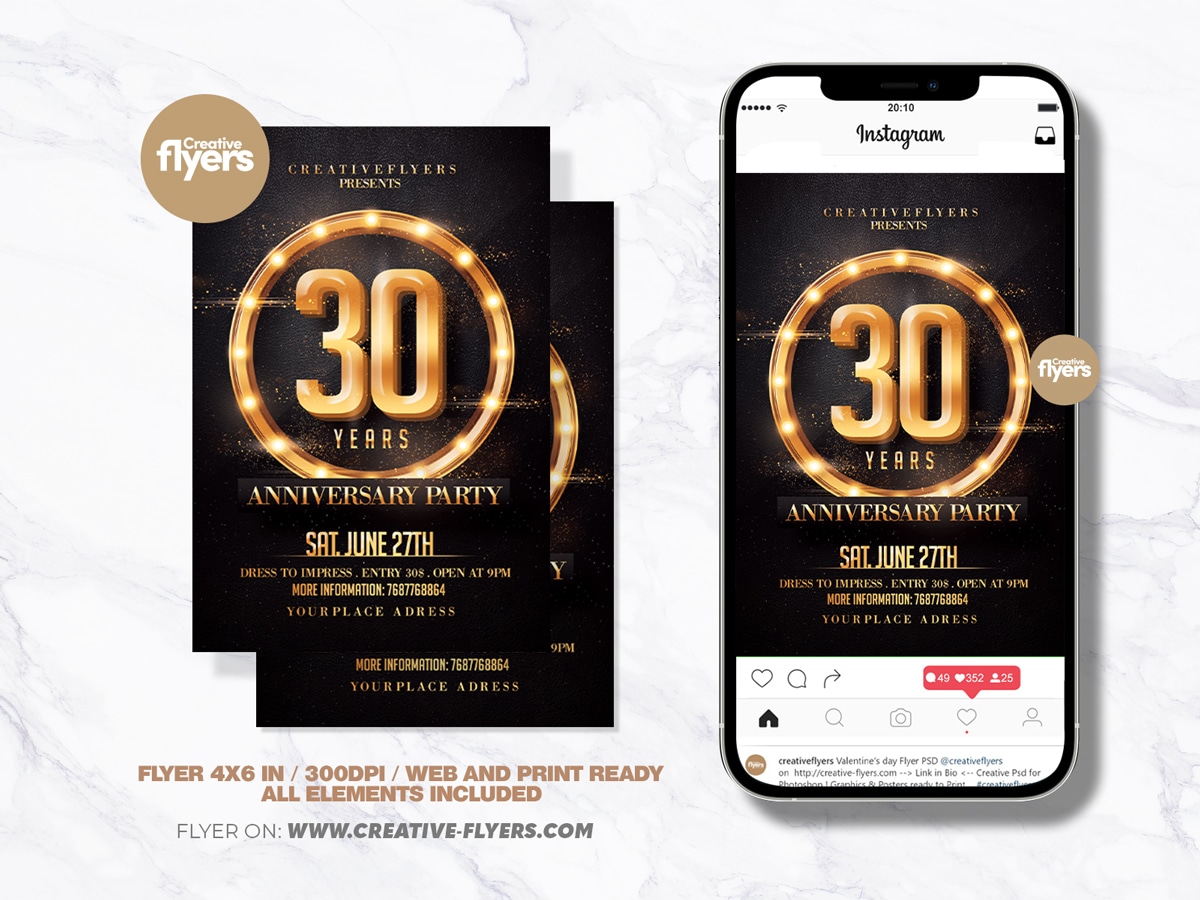 You are looking for a flyer for a special birthday! here is the perfect flyer. Preparing a graphic flyer can be complicated, that’s why we created this elegant flyer, a gold graphic element on a black background. Thanks to this anniversary template saves a lot of time for a quality result.