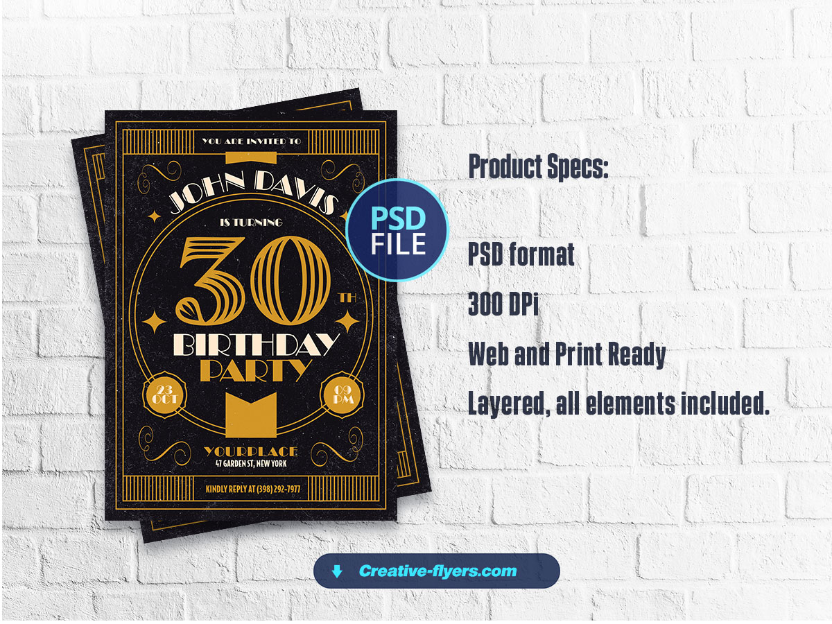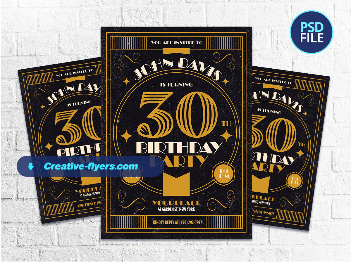 Image is a vintage-style birthday party invitation with an art deco design. The layout features a black background with gold and white text and geometric patterns. The central focus is on the number ’30th’ in an oversized, stylized font with ‘BIRTHDAY PARTY’ beneath it in a bold, uppercase typeface. The design is framed with decorative lines and shapes (Art Deco Style), enhancing the elegant, celebratory theme.