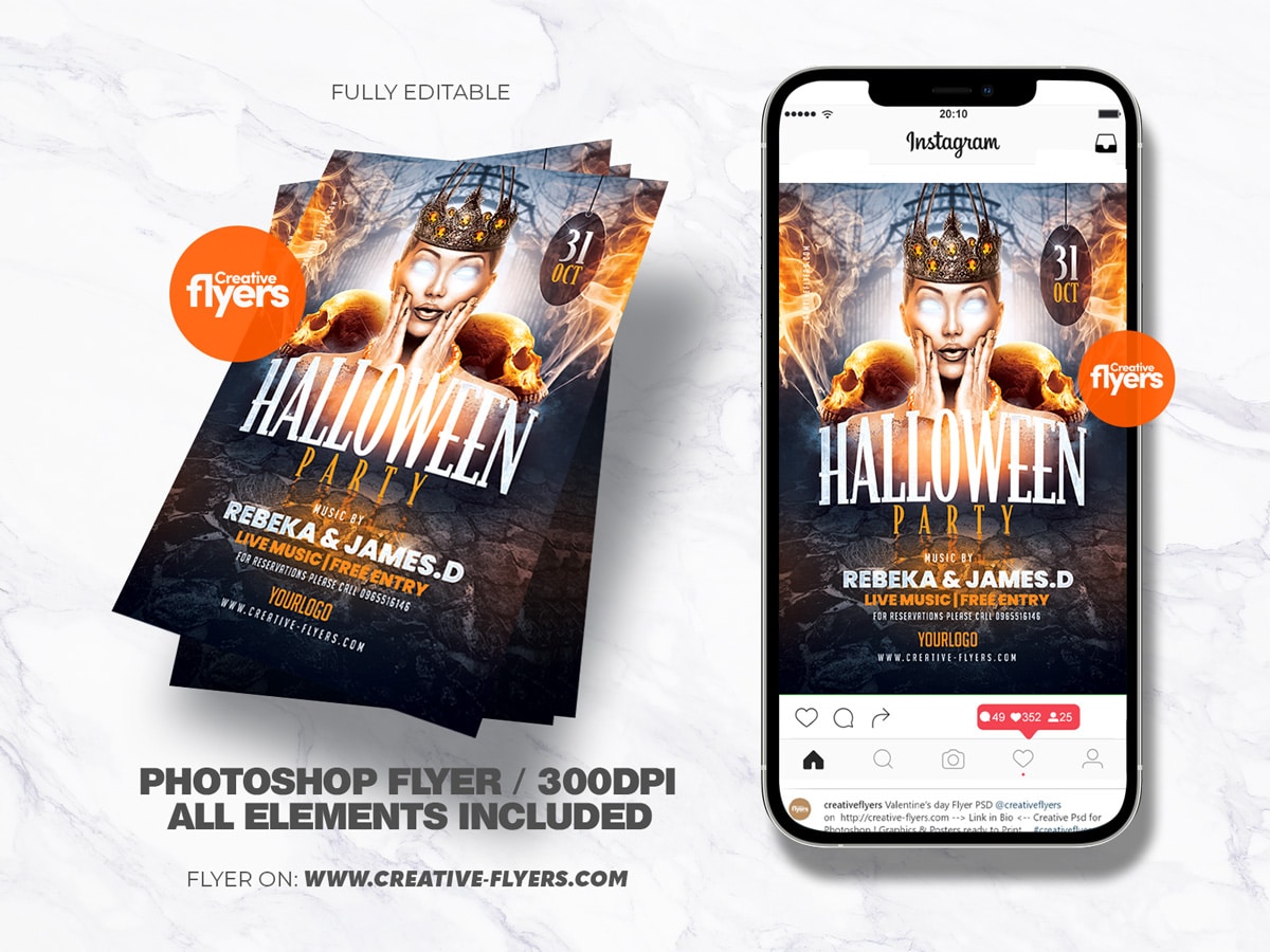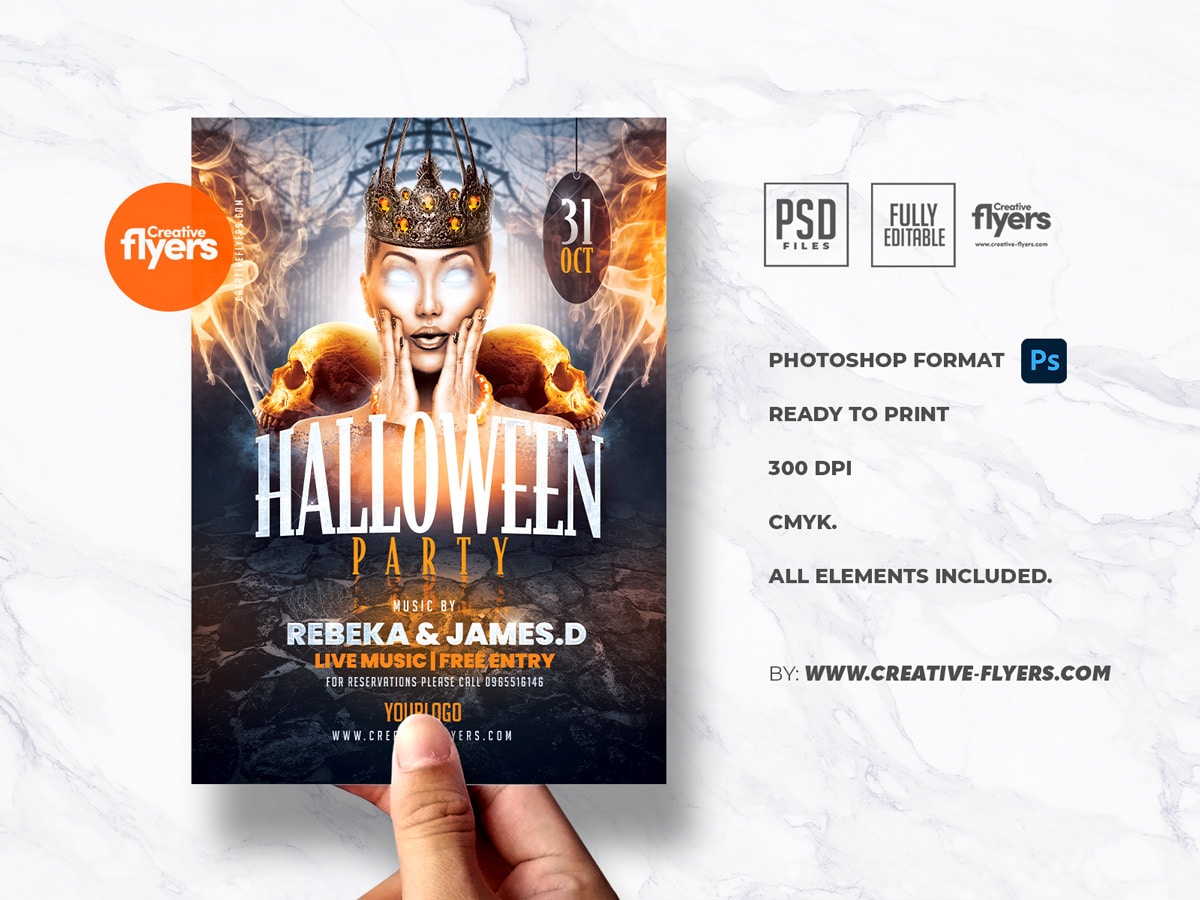 If you have not organized your next event or party for Halloween, here is our flyer a great quality created for the evening of October 31st. A unique and original graphic design, an evil wizard in the center, skulls on each side spewing smoke, all this in a magigue and frightening atmosphere. All elements are included and easily modifiable. Adaptable flyer for “day of the dead” event.