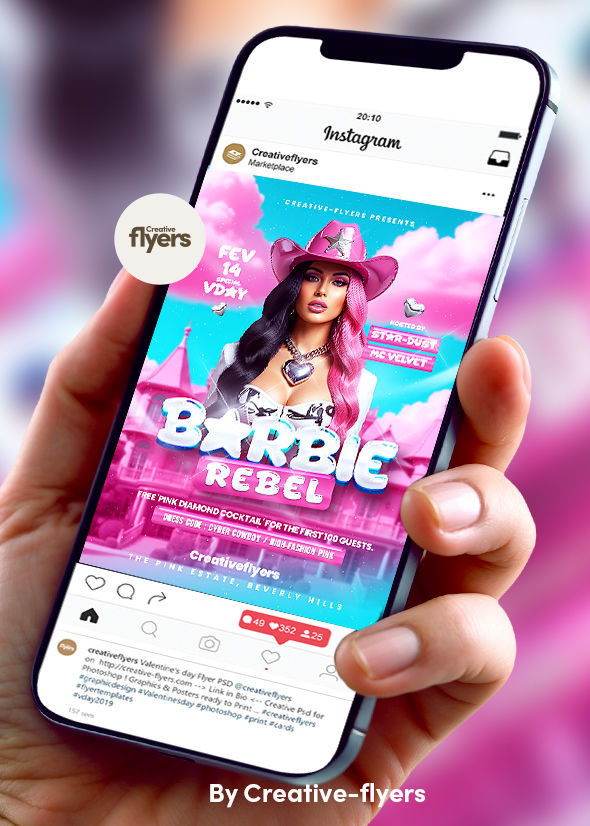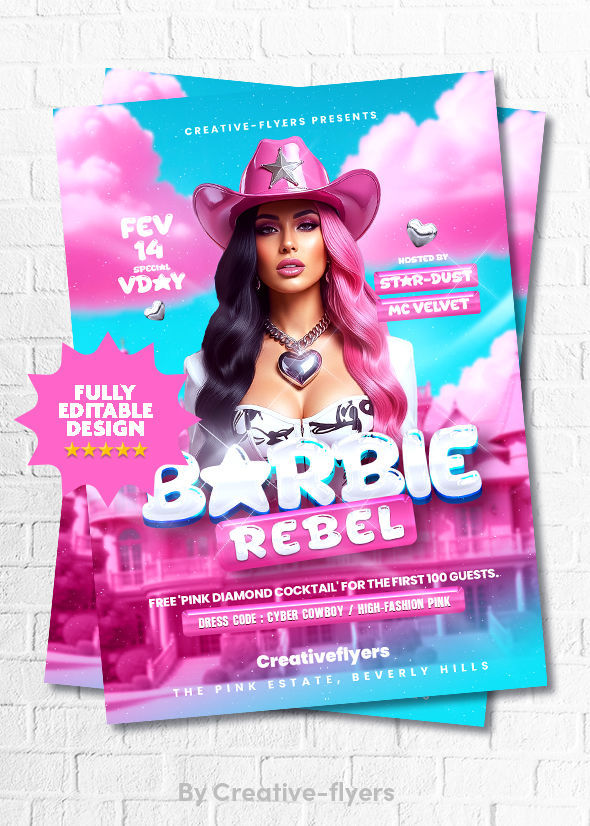 The “Vibe” Approach: Elevate your event branding with the Barbie Rebel PSD template. Blending high-fashion pink aesthetics with a “Cyber Cowboy” edge, this high-resolution file is perfect for Valentine’s Day or luxury club nights. Featuring easily editable layers and smart objects, you can customize the text and layout in minutes to create a stunning, professional promotion that captures the “Barbie-core” trend perfectly.