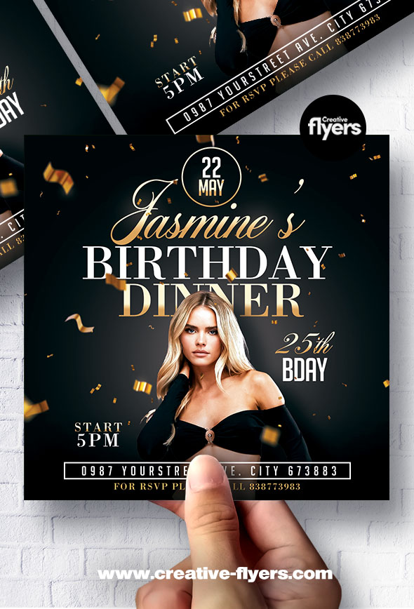 Stylish and elegant birthday dinner invitation flyer. The layout features a dark background with gold and white text. The text ‘BIRTHDAY DINNER’ is written in a mix of cursive and bold fonts. To the right, ’25th BDAY’ is written in a white, elegant font. Perfect anniversary template to promote elegant event…
