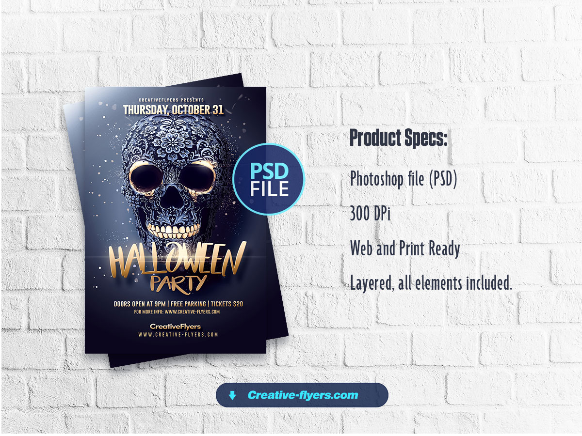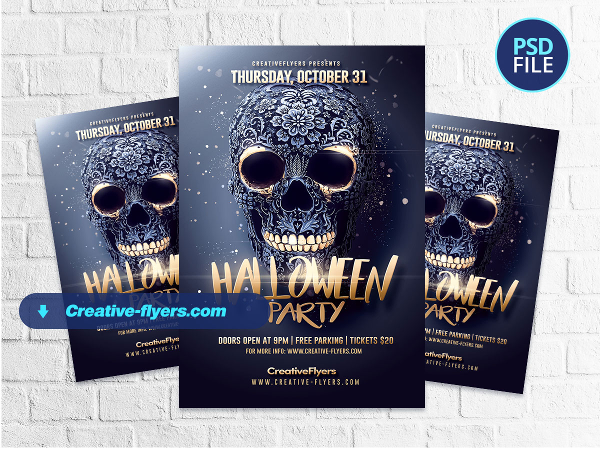 Digital halloween poster with a dark, mysterious theme, featuring a highly detailed and ornate skull as the central subject. The skull is intricately decorated with floral patterns in shades of white and gray, set against a deep black background. Below the skull, the words ‘HALLOWEEN PARTY’ are prominently featured in a large, gold, stylized font. The overall design is sleek and eye-catching, with a focus on the Halloween theme. Adaptable flyer for “day of the dead” event (Dia de los muertos).