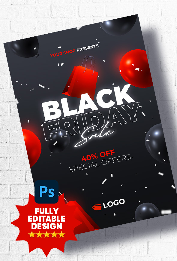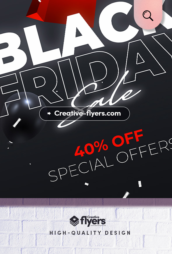 This Black Friday flyer combines modern minimalism with bold visual energy. The use of red and black tones creates a luxurious and dynamic contrast, while floating 3D elements add depth and movement. Perfect for promoting sales or special events, this design captures attention with elegance and clarity.