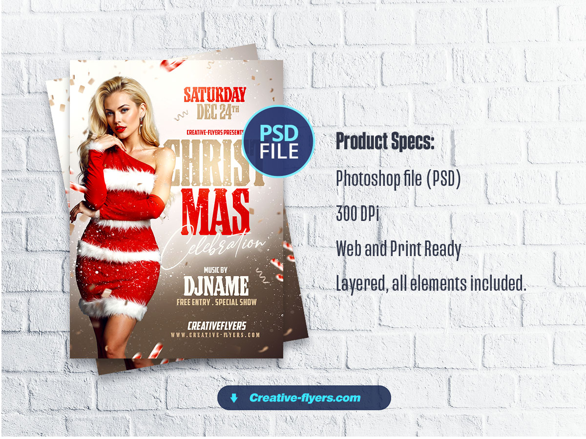 Festive promotional flyer featuring a glamorous holiday theme. The layout is vertical with a central focus on a woman dressed in a red and white Santa-inspired outfit. The main event title ‘CHRISTMAS Celebration’ is prominently displayed in large, bold white and red letters. The overall design is festive and eye-catching, with a focus on holiday celebration.