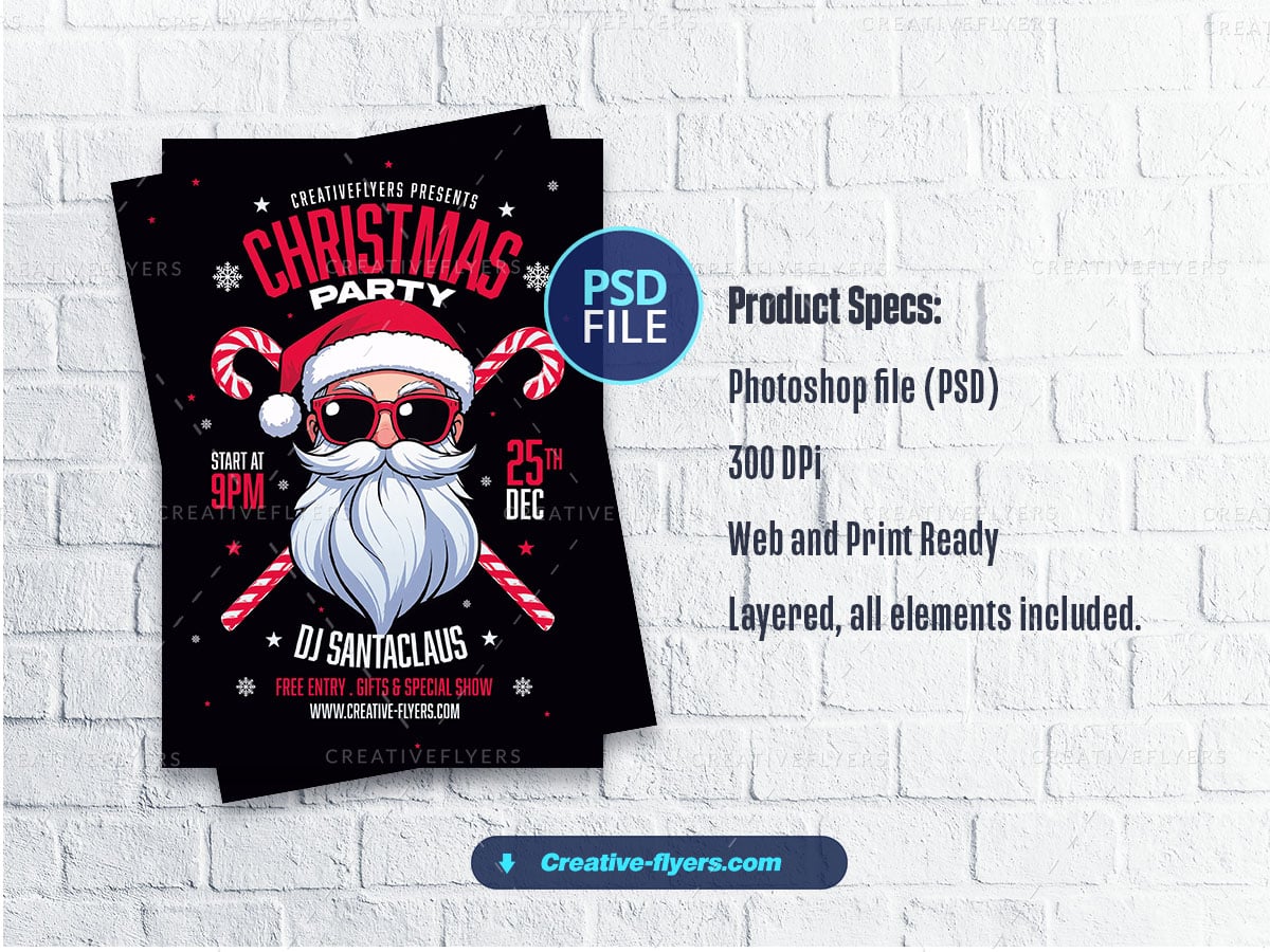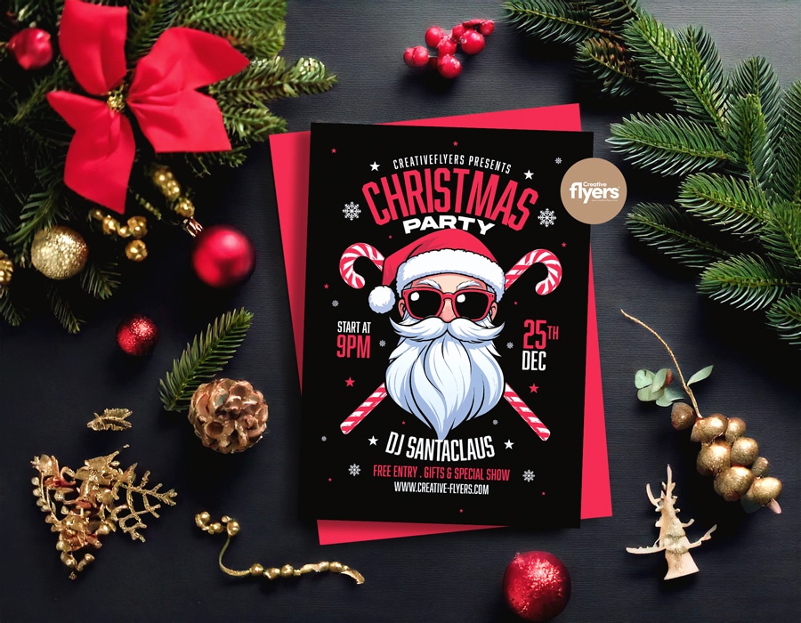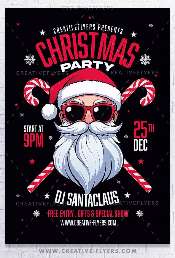 Festive Christmas party flyer with a bold and vibrant design. The layout features a central illustration of a stylized Santa Claus wearing sunglasses and a Santa hat, with a long white beard. The background is black, enhancing the bright red and white color scheme. The text ‘CHRISTMAS PARTY’ is prominently displayed at the top in large, red, uppercase letters with a slight arch…