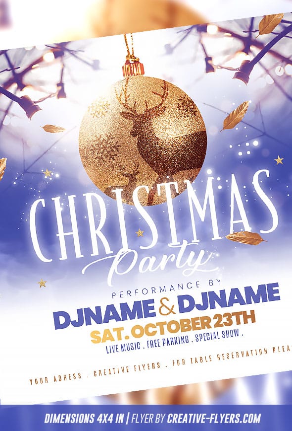 Festive Christmas party flyer with a winter-themed design. The background features a snowy landscape with bare tree branches and a clear blue sky. In the center, there is a large, golden Christmas ornament adorned with intricate patterns, hanging from a branch. The text ‘CHRISTMAS Party’ is prominently displayed in elegant, white, and gold script across the middle. The overall layout is balanced and visually appealing, with a focus on the holiday theme.
