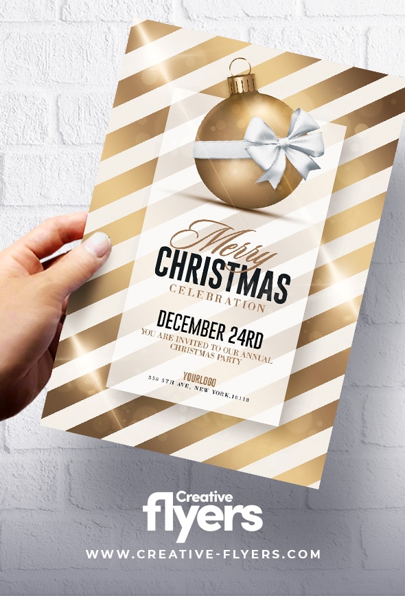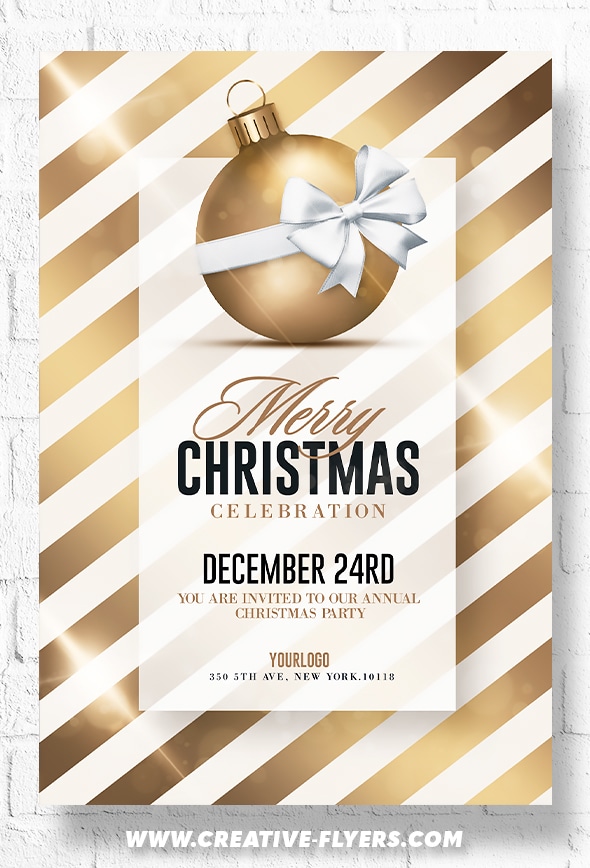 Stunning white and gold flyer template with Christmas decorations and beautiful light effects, created to announce your next Christmas party, this flyer is a top notch design that you can edit with just a few clicks.