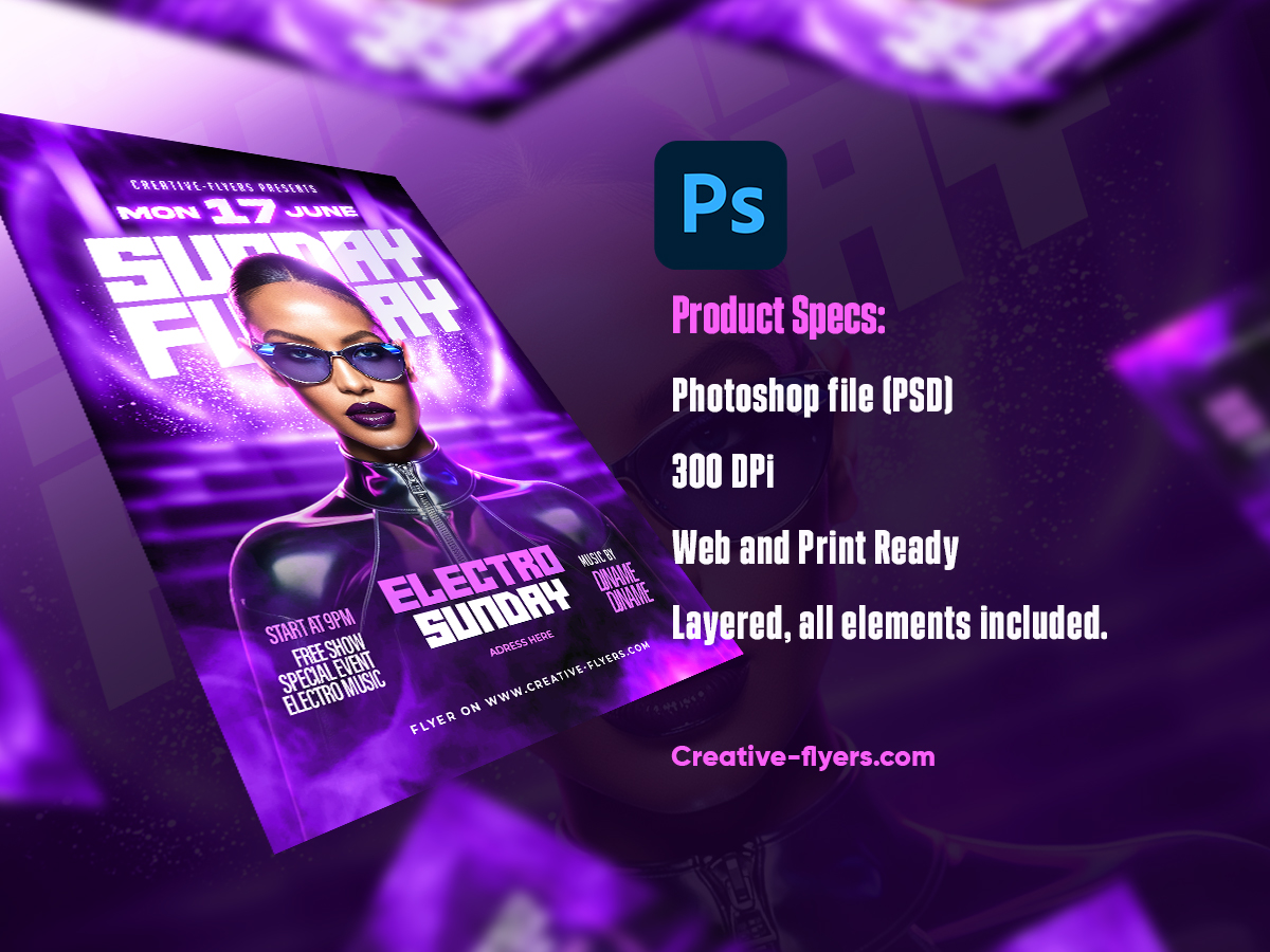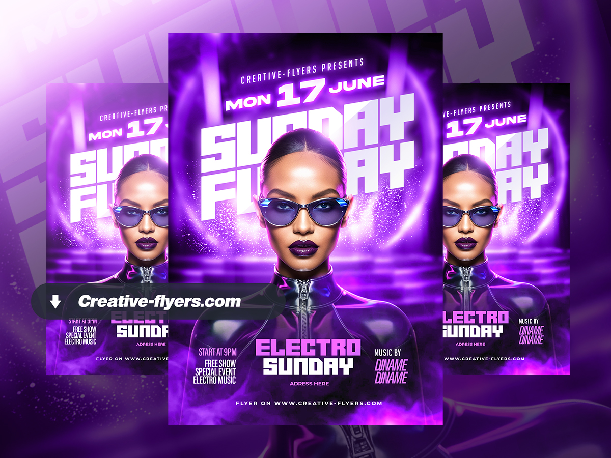 Vibrant and modern event flyer featuring a bold and futuristic design. The layout is centered around a striking image of a woman with reflective sunglasses and purple lipstick. The background is a dynamic mix of purple and pink hues with abstract light effects. The flyer also includes all texts informations to promote your nightclub event… Perfect design for Electro party, house music event, concert, Dj show…