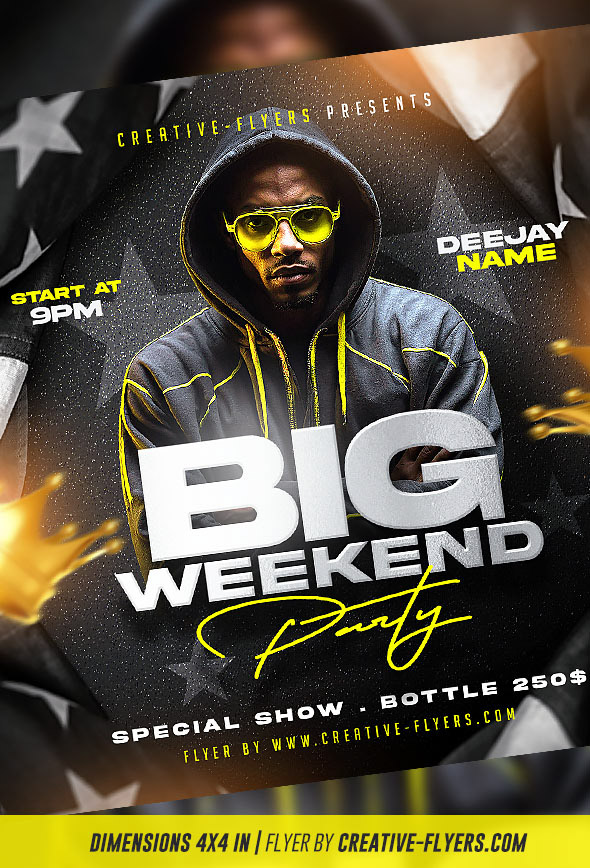 Party flyer with a modern and dynamic design, exuding a cool and Hip hop vibe. The background is a blurred mix of black and white star patterns, adding a sense of movement and energy. Below, the main text ‘BIG WEEKEND Party’ is prominently featured in large, bold, white and yellow fonts…