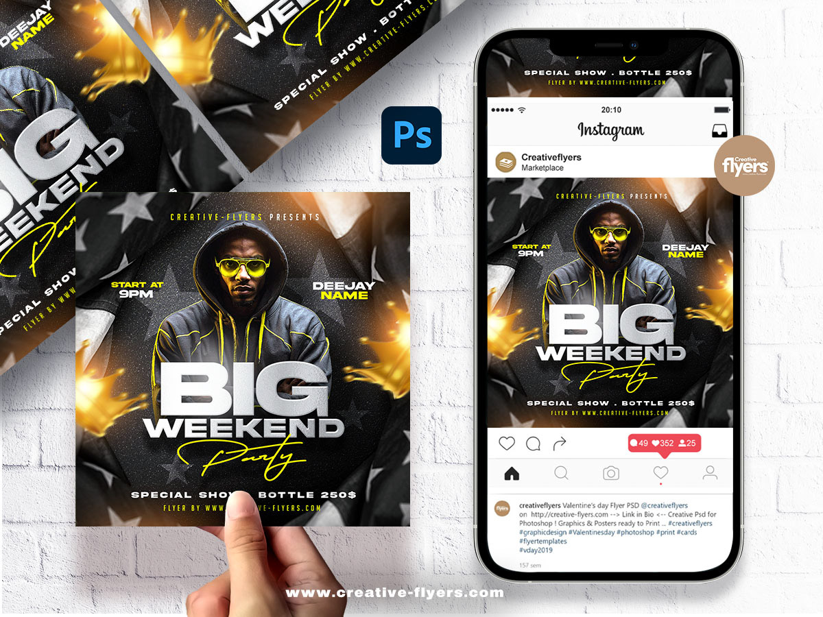 Party flyer with a modern and dynamic design, exuding a cool and Hip hop vibe. The background is a blurred mix of black and white star patterns, adding a sense of movement and energy. Below, the main text ‘BIG WEEKEND Party’ is prominently featured in large, bold, white and yellow fonts…