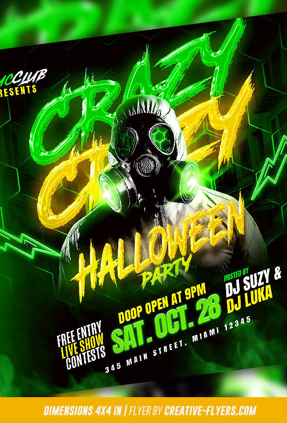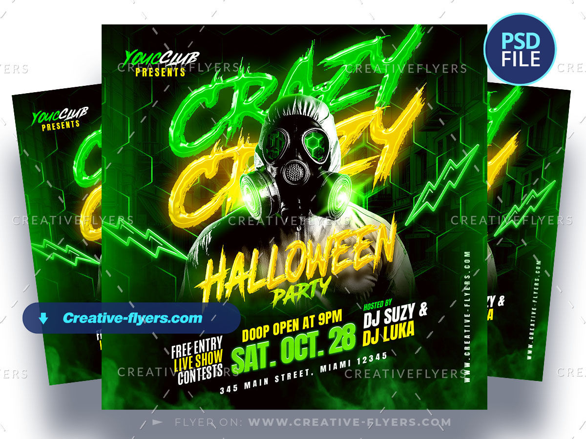 Vibrant and dynamic flyer for a Halloween party. The layout features a central figure wearing a gas mask, with a dark background and neon green and yellow accents. The text is bold and eye-catching, with ‘Crazy Crazy Halloween Party’ in large, graffiti-style green and yellow letters at the top. Below, details about the event are provided in various fonts and colors.