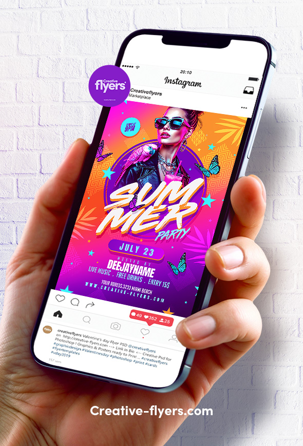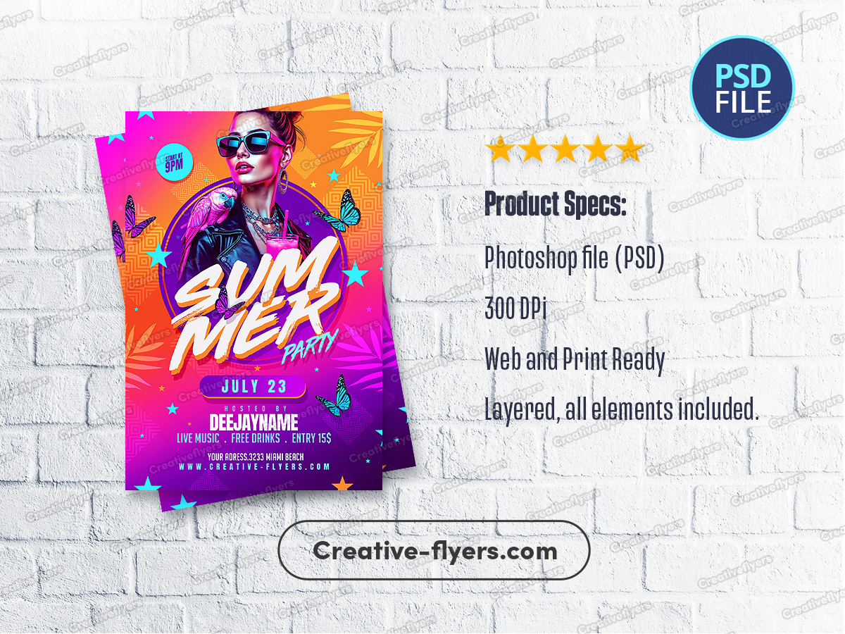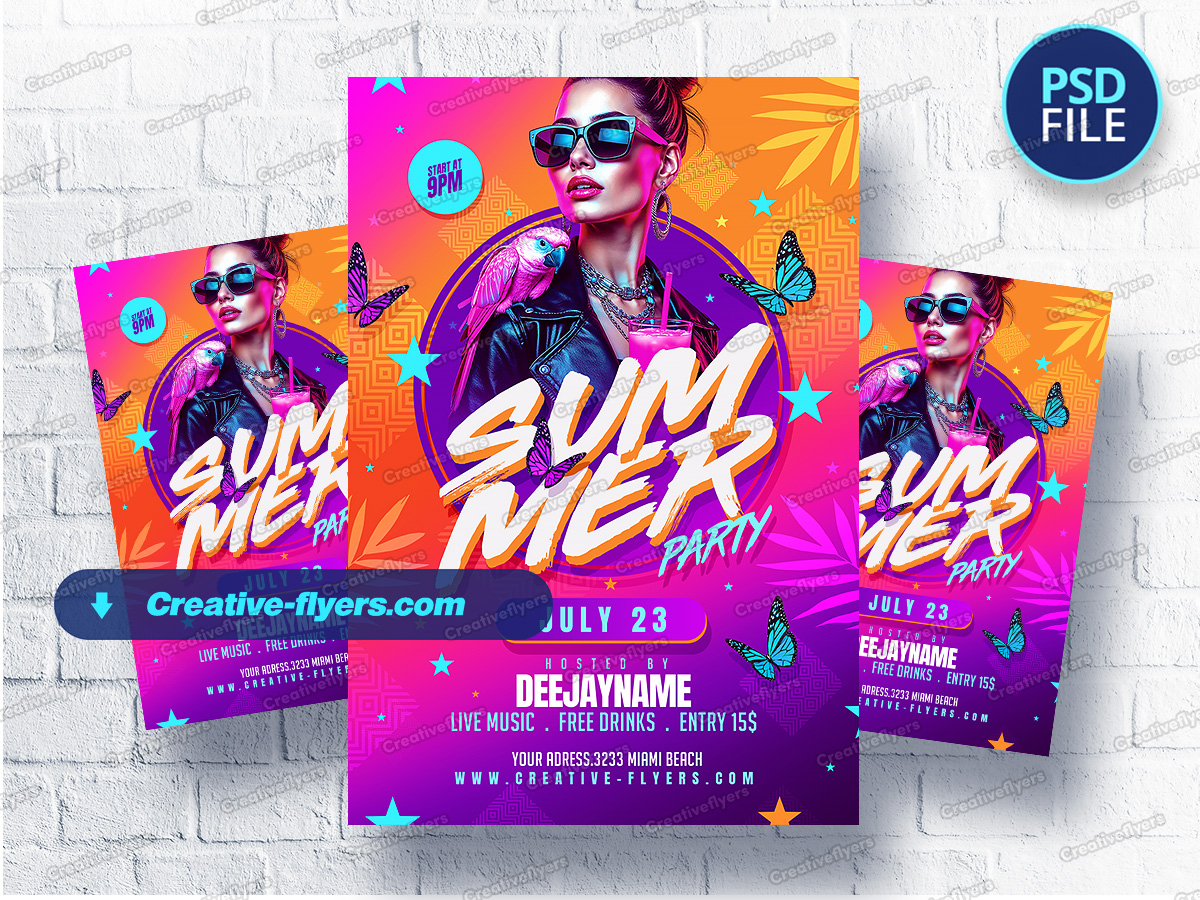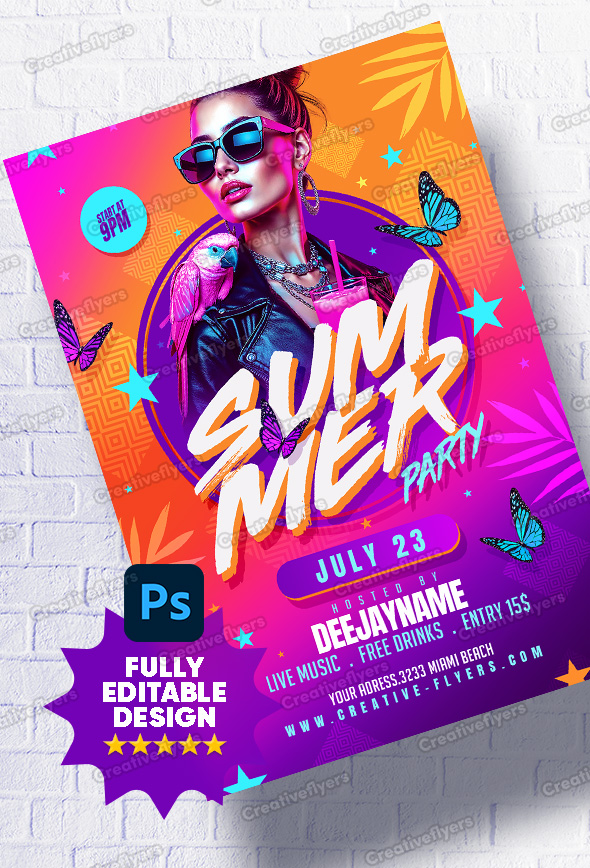 Designed with a vibrant summer palette, this flyer captures the heat and energy of a Miami beach party. Bright oranges, purples, and neons surround a confident woman with a parrot on her shoulder, tropical drink in hand. Elements like butterflies and palm leaves add to the festive vibe. Ideal for promoting live music events, open-air clubs, and nightlife scenes.
