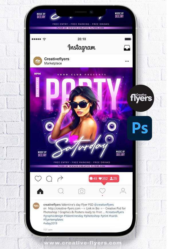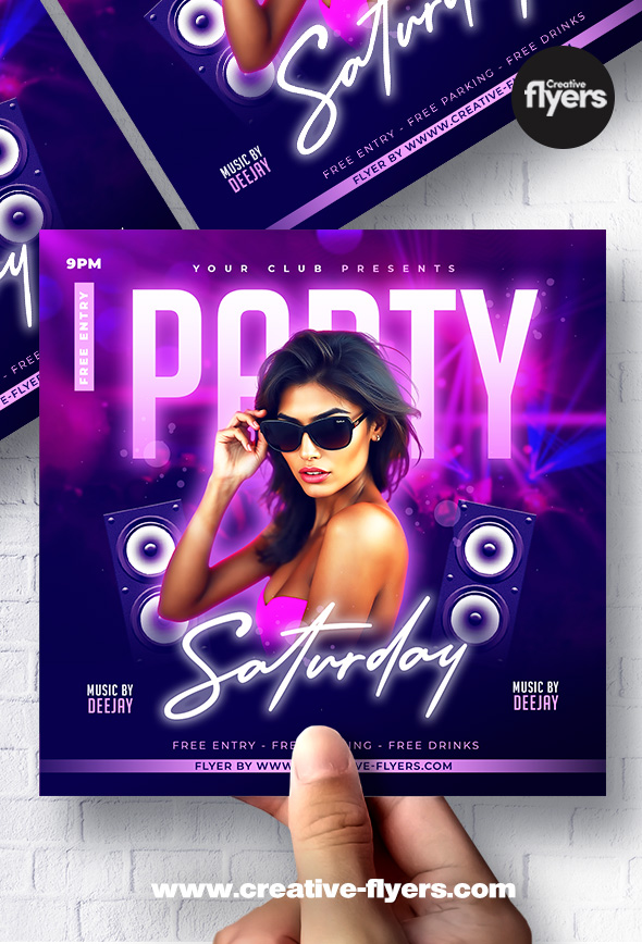 This flyer was designed to capture the energy of a Saturday night club party. Featuring bold neon purples, glowing text, and a confident central model, it speaks to party lovers looking for a stylish, high-energy night out. The clean layout promotes free entry, drinks, and music in a modern aesthetic.