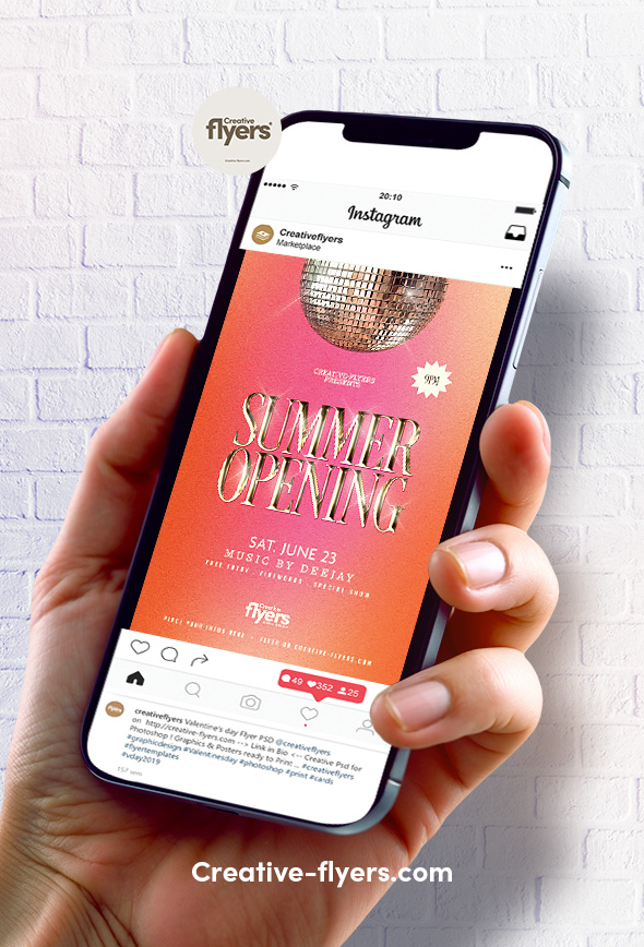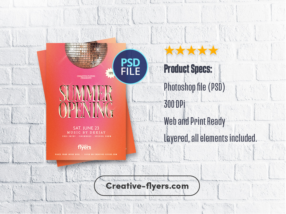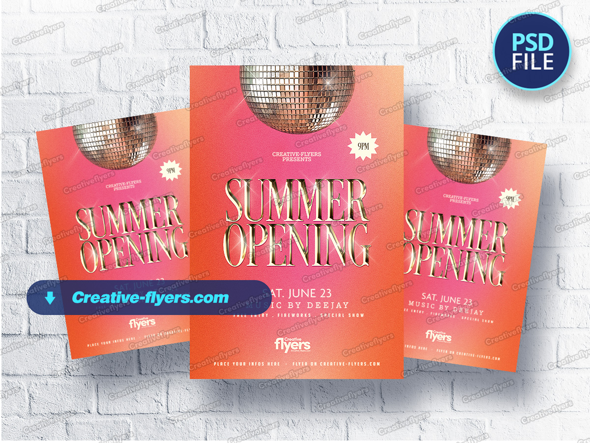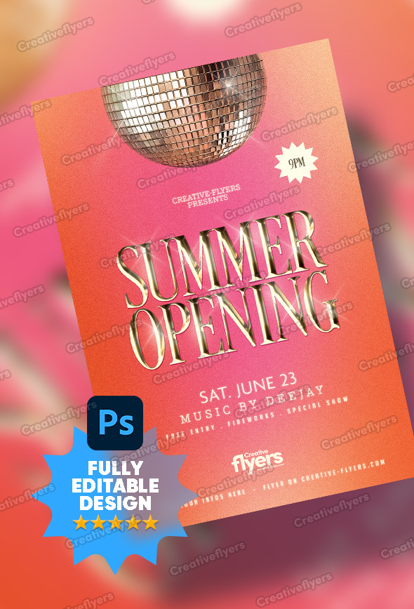 A chic and retro-inspired flyer for your Summer Opening party, this design uses a shimmering disco ball, radiant orange-pink gradients, and metallic font to evoke energy and elegance. Great for club promos, it combines clean layout and modern touches to catch attention in both print and digital formats. Easily editable for any summer event.