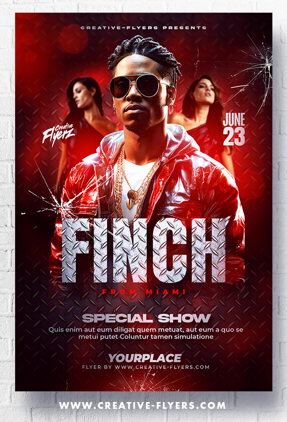 Special flyer announcing a show, a nightclub show, a DJ… The flyer has a dark red background with textured geometric patterns, and luminous effects and red light. The name of the artist is written in large letters with a metallic effect in the center, a flyer has an urban and dynamic style, which attracts the attention of the viewer.