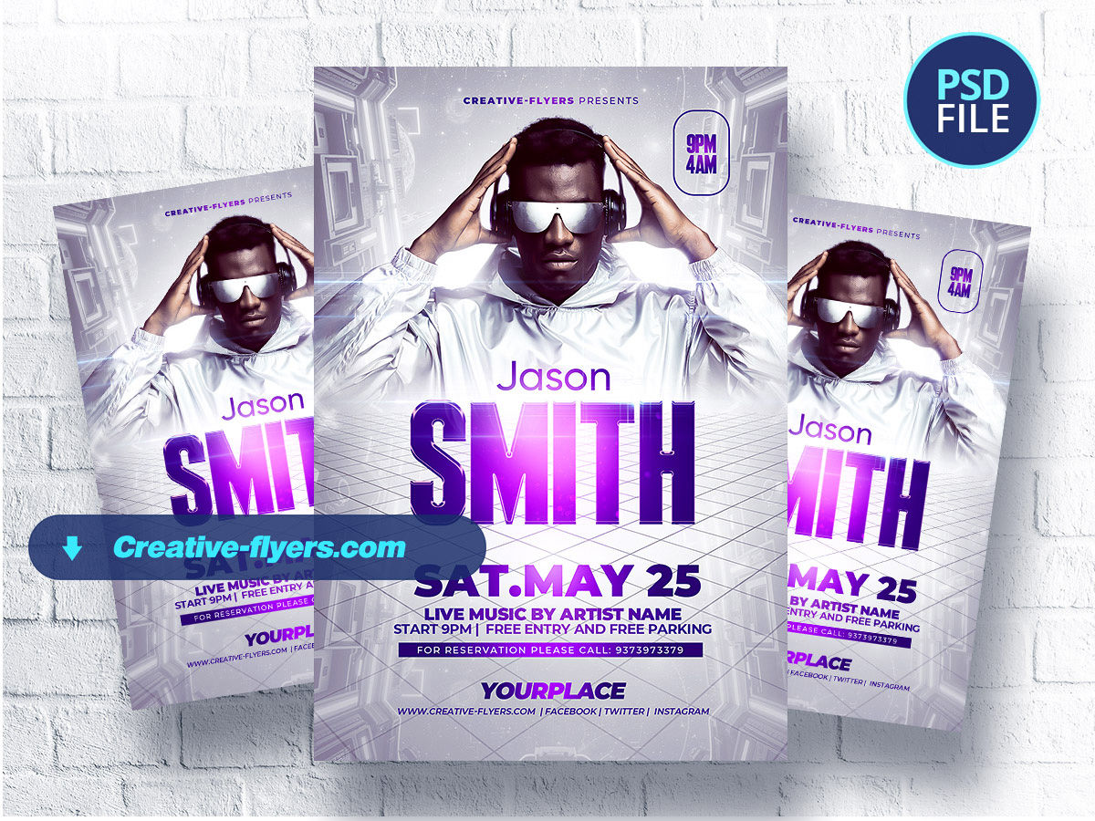This Flyer captures the essence of a futuristic DJ party with a sci-fi-inspired background and glowing purple typography. The artist, highlighted at the center with a sleek metallic outfit and cyberpunk aesthetics, adds a dynamic focal point. The flyer combines modern digital elements with bold typography to create a visually striking and immersive design, making it ideal for promoting a high-energy music event.