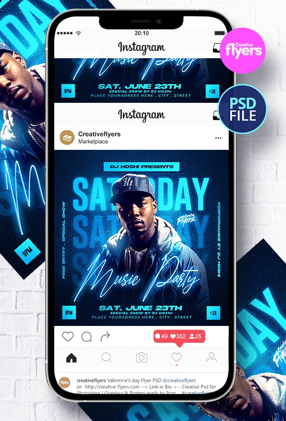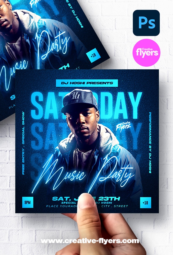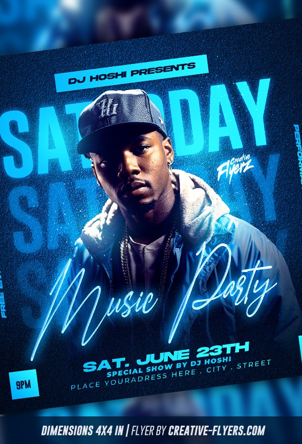 This flyer is for a music party called โSaturday Music Partyโ, perfect for a club event, a DJ event, or others… The atmosphere of the flyer is nocturnal and festive, with blue and black tones. Itโs an eye-catching design that seems perfect for announcing a lively musical evening!