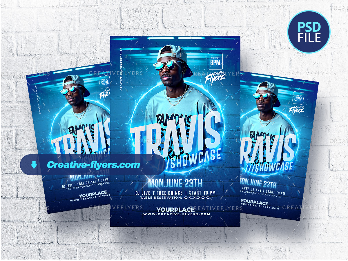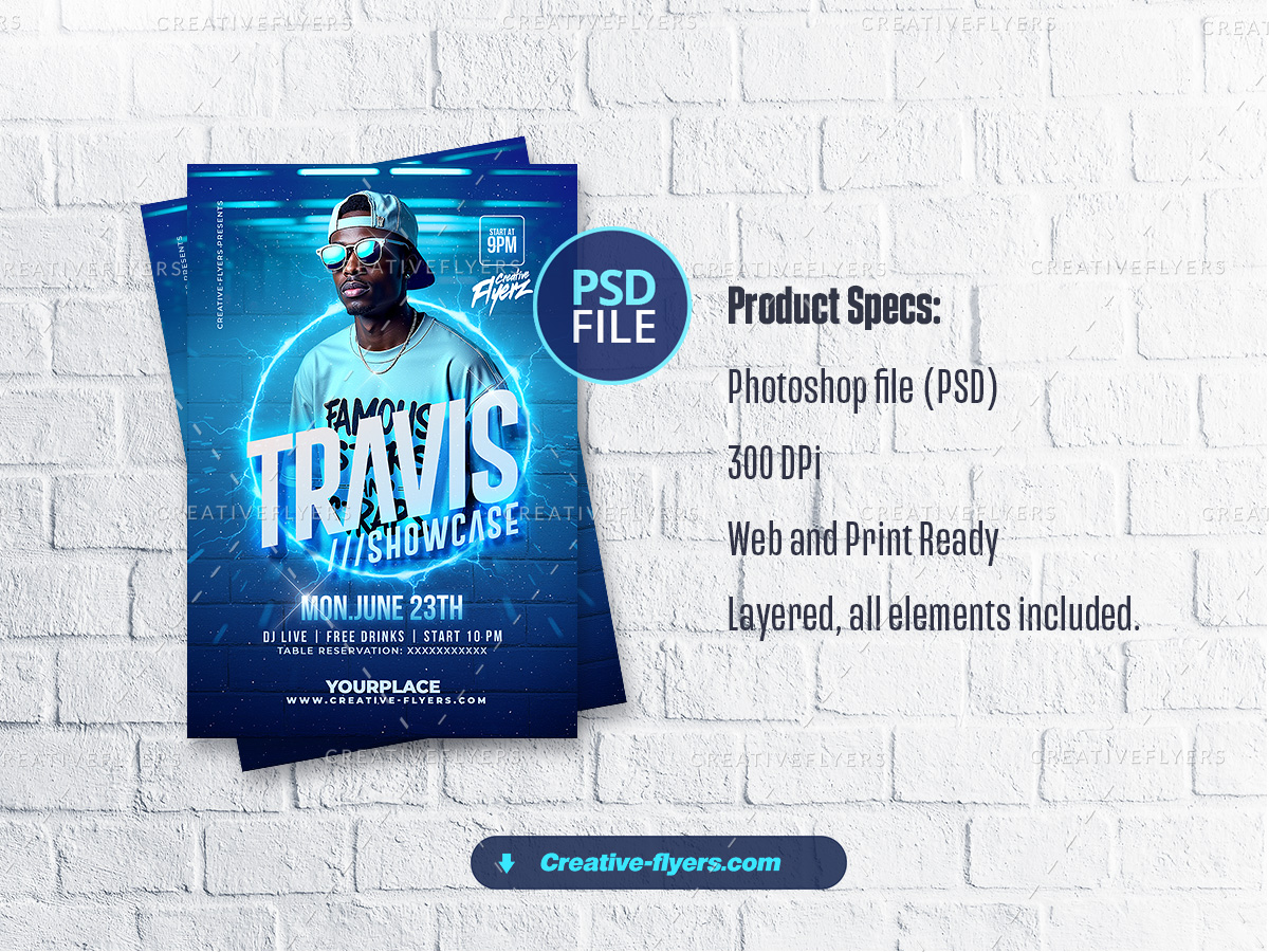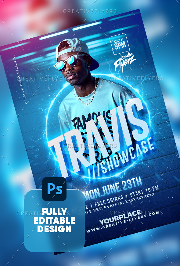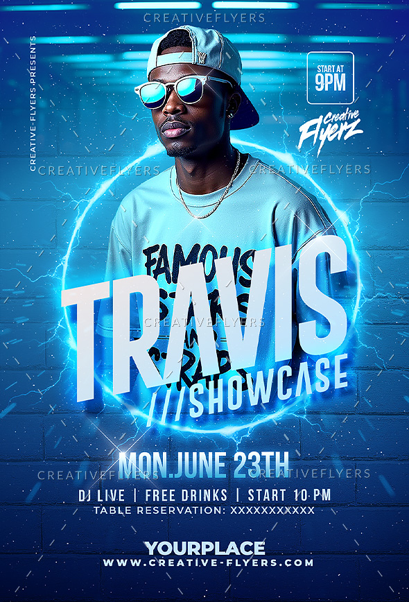 Designed to promote a dynamic DJ showcase, this flyer uses a tech-inspired neon palette and electrifying effects. The artist is central, framed by glowing light streaks and digital elements that suggest high energy. Fonts are bold, clear, and futuristic. Every element—from shadows to layout—conveys excitement, precision, and exclusivity for a late-night event.