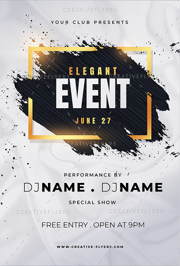 Modern and stylish event flyer with a sleek and professional design. The layout features a white background with a subtle marble texture, overlaid by a bold black paint splatter in the center. A gold rectangular frame surrounds the central text, adding a touch of elegance. The overall design is clean and eye-catching, suitable for promoting a elegant event, opening party, birthday celebration, graduation party…
