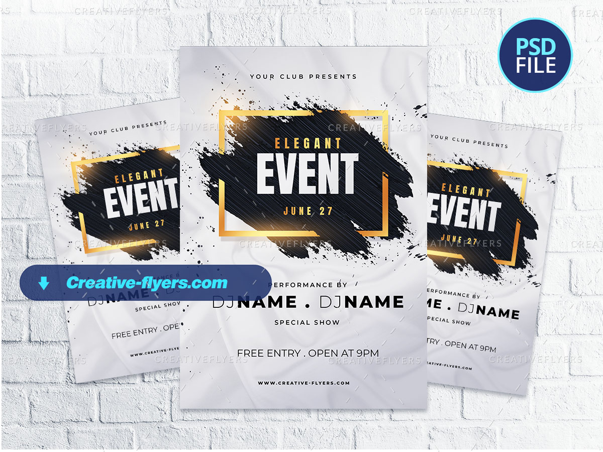 Modern and stylish event flyer with a sleek and professional design. The layout features a white background with a subtle marble texture, overlaid by a bold black paint splatter in the center. A gold rectangular frame surrounds the central text, adding a touch of elegance. The overall design is clean and eye-catching, suitable for promoting a elegant event, opening party, birthday celebration, graduation party…