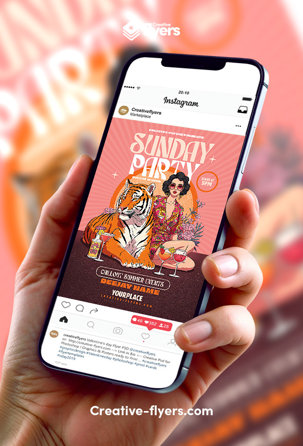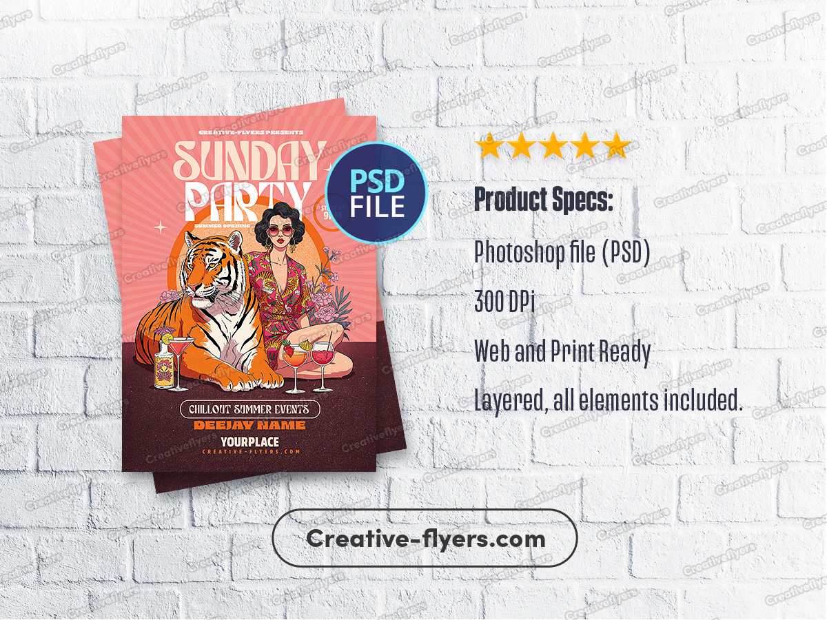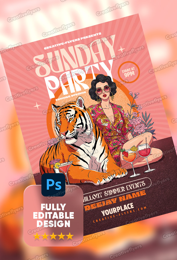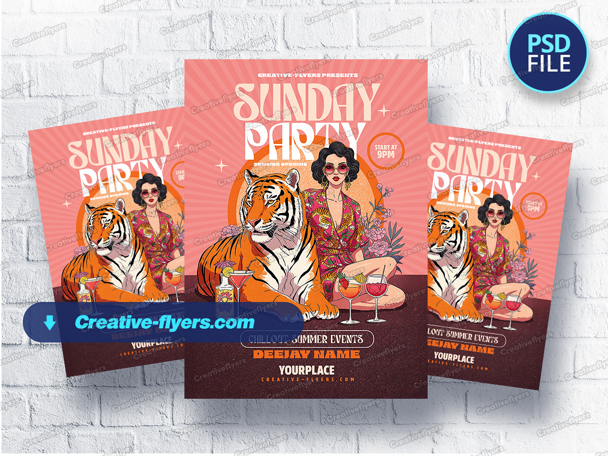Cocktail Hour with a Tiger, featuring strong illustration work and custom typography, this flyer was created to promote a stylish Sunday summer party. The central tiger symbolizes power and calm, while the fashionable woman adds elegance. Retro colors, Jungle style, floral details, and cocktails reinforce a laid-back, luxury feel perfect for summer opening, a DJ chillout lounge event.