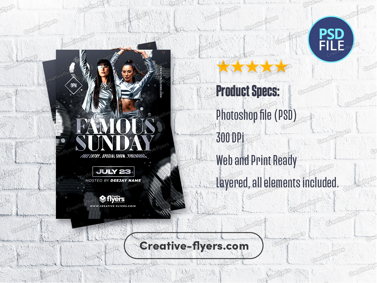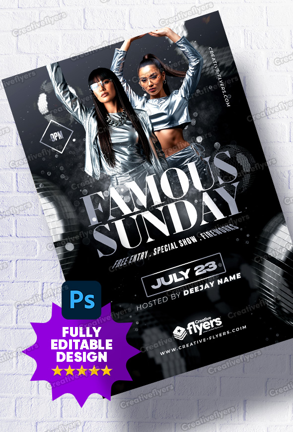 This flyer was created for an upscale Sunday night party. Silver tones, chrome outfits, and disco lighting set a glamorous, futuristic mood. The typography is elegant and refined, contrasted with bold callouts for the date and DJ. The background includes subtle mirrored effects and confetti to evoke a high-end club atmosphere.