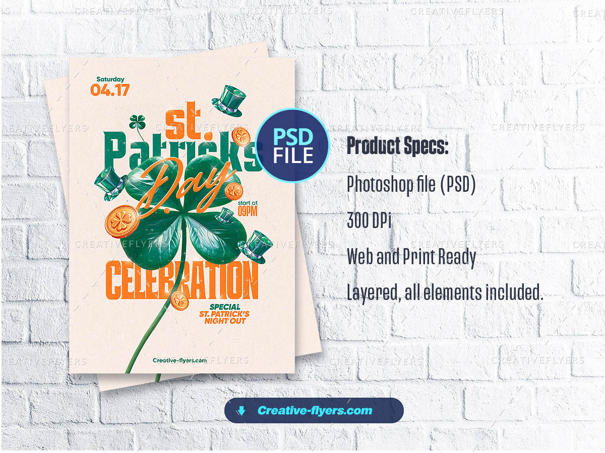 This flyer captures the spirit of St. Patrick’s Day with a striking four-leaf clover at the center, symbolizing luck and festivity. Surrounding elements like floating leprechaun hats and gold coins enhance the playful atmosphere. The green and orange color scheme highlights the Irish theme, while bold typography ensures clarity and excitement. The flyer is designed to grab attention and attract attendees.