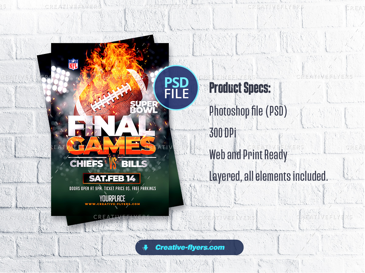You haven’t announced the biggest sporting event of the year yet, this flyer for the Super Bowl Finals is perfect to do it in a few clicks. This product is a professional quality modern photoshop template. You can use this template for any sporting event, superbowl or others and you can also customize the colors to get your desired result. All elements are included and editable.