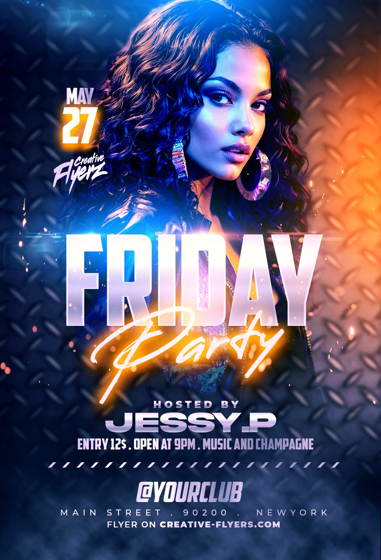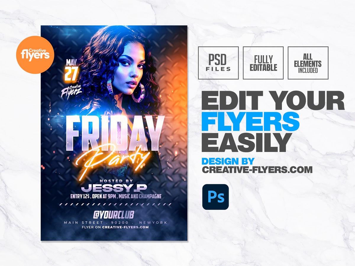 Superb flyer template for nightclub. Hyper realistic design, quality light and texture, models are included. Composite graphic element fully editable.