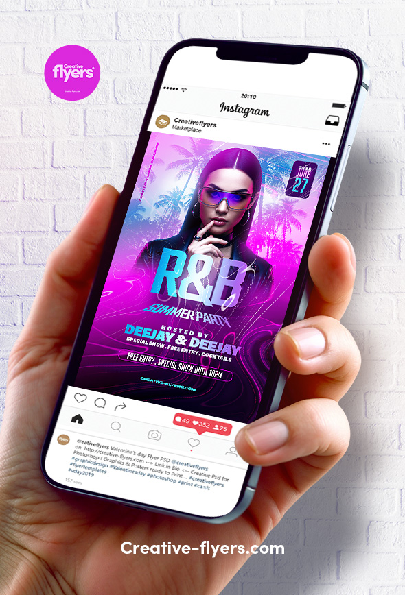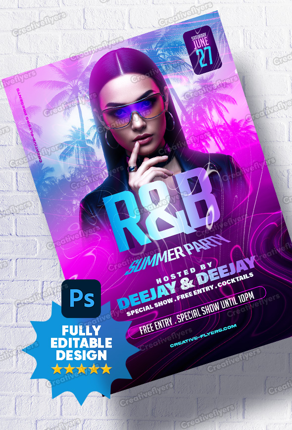The flyer design balances elegance and edge with bold colors and futuristic details. Featuring a glamorous central figure, glowing lines, and layered palm trees, it grabs attention instantly. Aimed at trendy partygoers and urban music fans, this visual makes a strong promotional statement for a summer event.