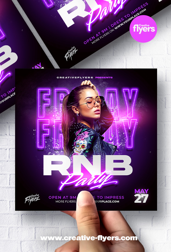 The flyer features an RNB party. Club flyer with a black background with white and purple text. The title “RNB Party” is displayed in white capital letters. The flyer also includes an image of a woman wearing glasses. The image is located in the center of the flyer. A perfect graphic design to announce a theme evening, Rnb, nightclub events, girls night party, ladies night, or even an electro house evening, the flyer is easily editable.