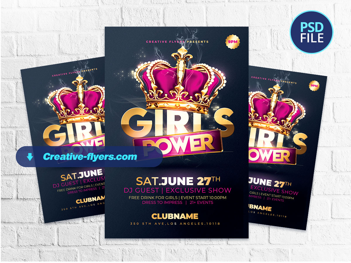 A vibrant and eye-catching event flyer with a dark background. Ornate golden crown with purple velvet and jewels sits atop the bold, 3D text ‘GIRLS POWER’ in gold and pink gradient. The overall design is sleek and modern, with a luxurious and festive theme. Perfect for Girls party, ladies night, or others events…