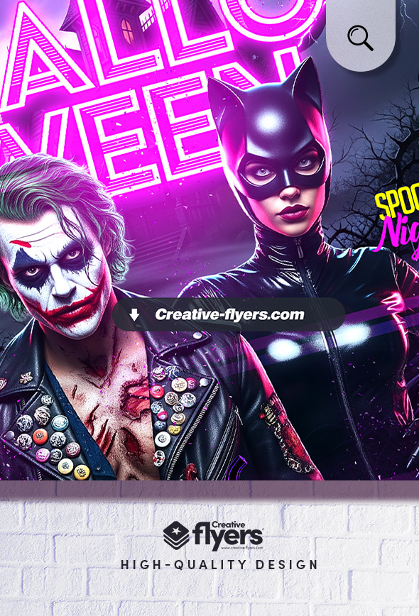 Designed for Halloween events, this digital flyer showcases a striking neon theme combined with horror-inspired characters. The Joker-like figure and Catwoman are framed by glowing pumpkins, dark shadows, and purple lightning, creating an electrifying atmosphere. The composition uses dramatic contrasts to grab attention and emphasize the spooky party vibe.