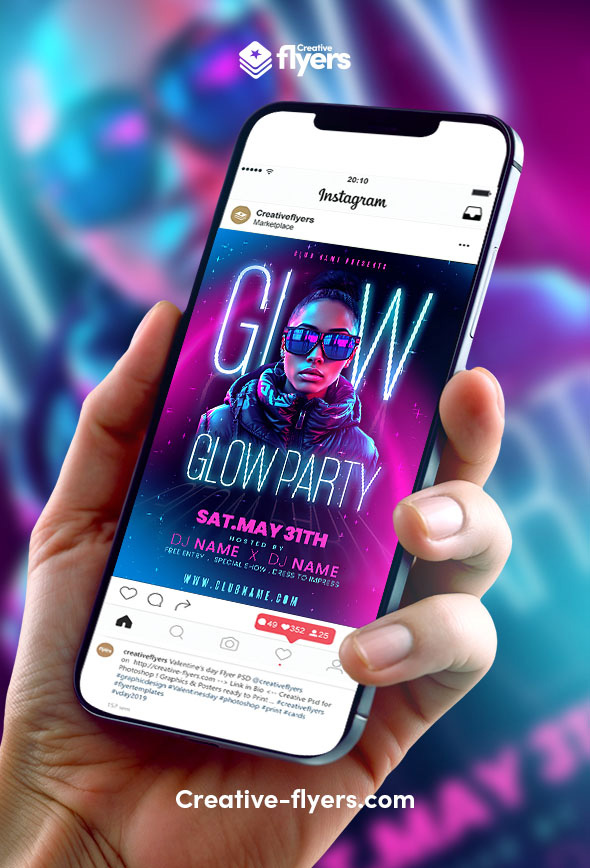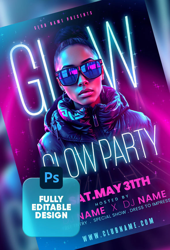 Designed in Photoshop, this flyer aims to highlight a modern glow party with neon aesthetics. The background blends cosmic elements with vibrant colors, while the bold subject in the center draws attention. Typography is minimal yet dynamic, with glowing text effects and complementary hues creating a unified party vibe perfect for DJ events and exclusive club nights.