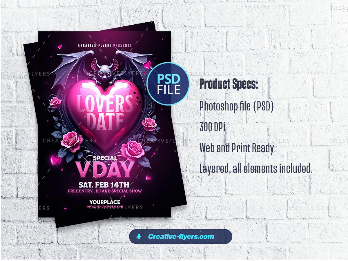 Vibrant and eye-catching flyer with a gothic romantic theme. The layout features a large, glossy pink heart at the center, surrounded by intricate black and purple floral designs and roses. The background is a dark gradient with scattered pink heart motifs, enhancing the romantic atmosphere. The bottom of the flyer includes a placeholder for a location, ‘YOURPLACE,’ in white text. The overall design is both elegant and playful, with a focus on love and saint valentine’s day celebration.