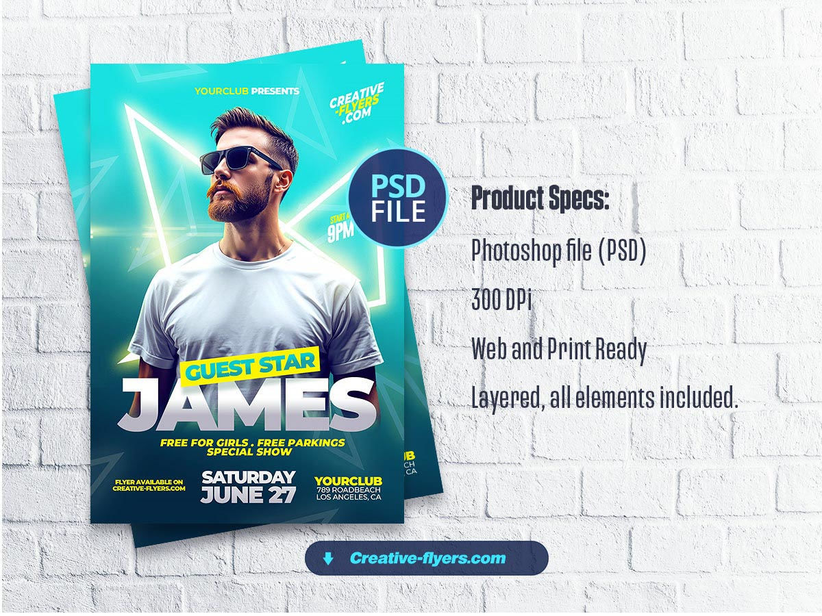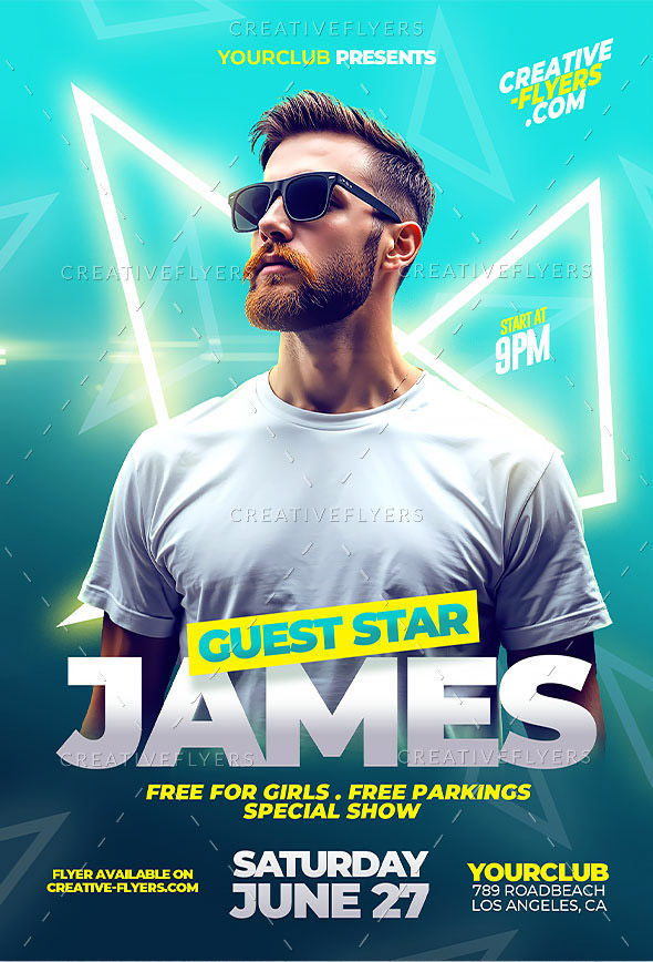 This vibrant club flyer features a Dj on a glowing teal-blue background with neon geometric shapes. The event details are highlighted in bold fonts, in white with a yellow overlay, indicating a special performance. The date, time, and additional perks are clearly mentioned for attendees. The overall style is bold and eye-catching, suitable for a club event advertisement, Artist music events in bars or music fectivals.
