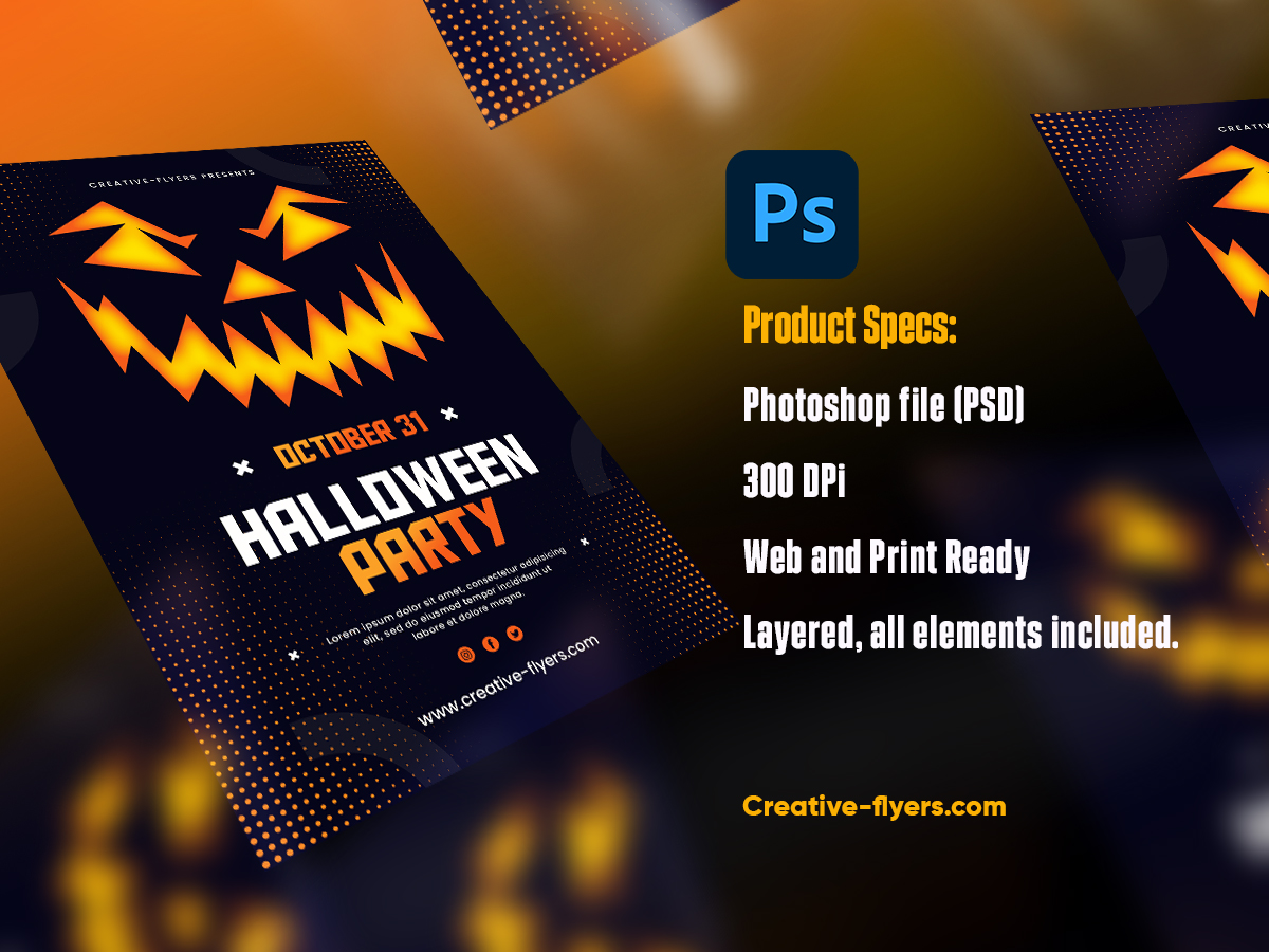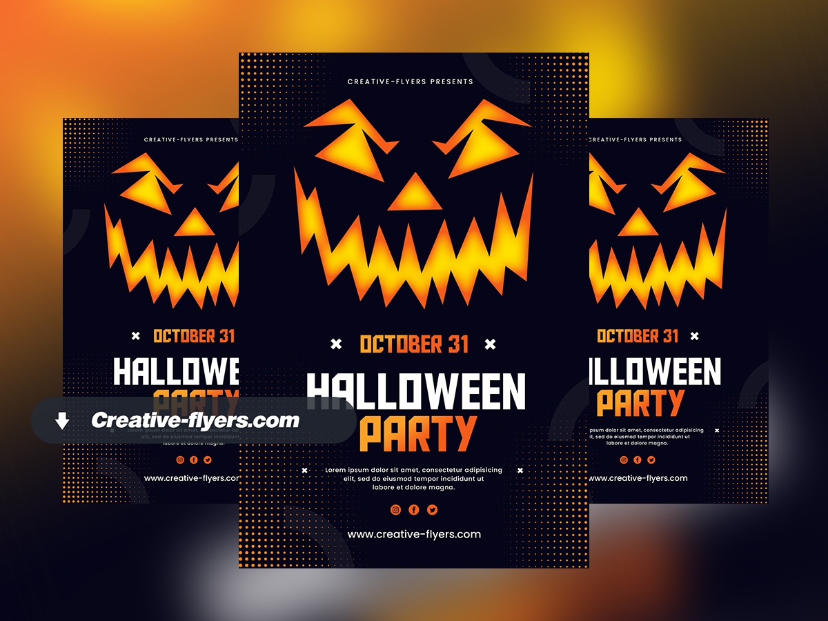 Digital flyer with a Halloween theme. The layout is vertical, featuring a prominent stylized jack-o’-lantern face at the top, rendered in bright orange and yellow gradients against a black background.The background features subtle dotted patterns and abstract shapes in dark grey, adding texture to the design. The overall style is modern and eye-catching, suitable for a festive event announcement.