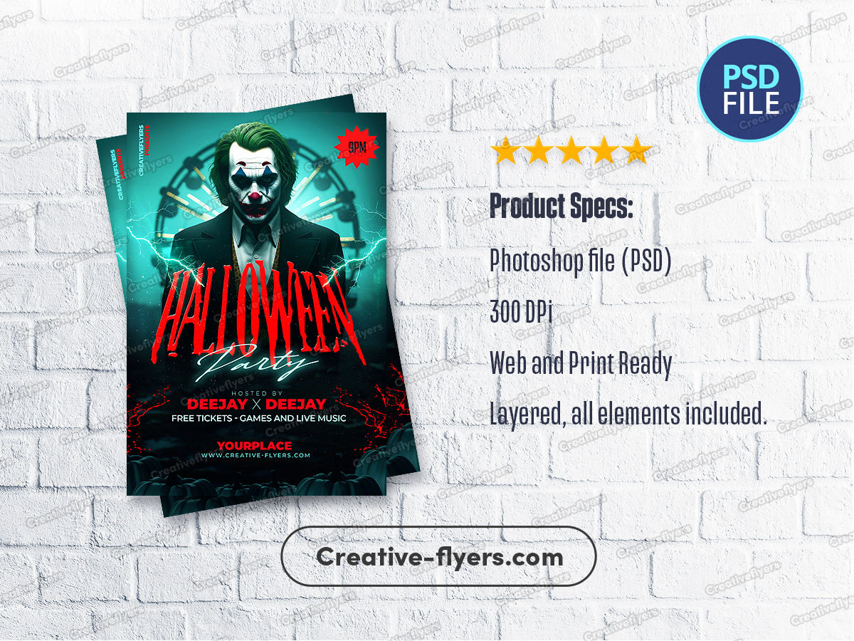 This Halloween flyer merges cinematic dread with club energy, featuring a Joker-inspired figure, electric blue glow, and red typography. The dramatic lighting and eerie background amplify tension, ideal for promoting a wild Halloween event full of games, live music, and free tickets. Dark Circus Flyer Design