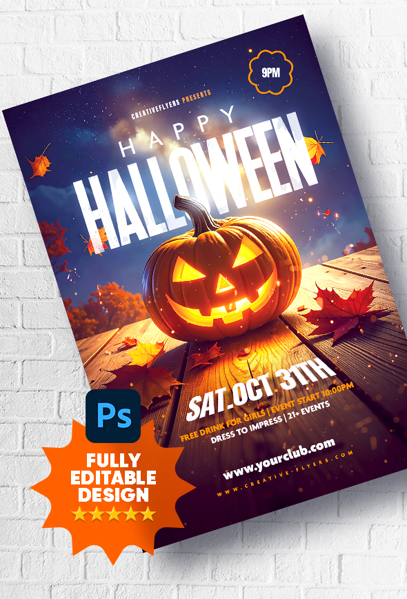 This flyer was created to capture the magical atmosphere of Halloween night with a glowing pumpkin centerpiece. The warm autumn tones, wooden textures, and falling leaves highlight seasonal charm while bold, modern typography ensures visibility. Designed for clubs, bars, or private parties, this flyer blends spooky vibes with elegance, making it perfect for promoting Halloween events.