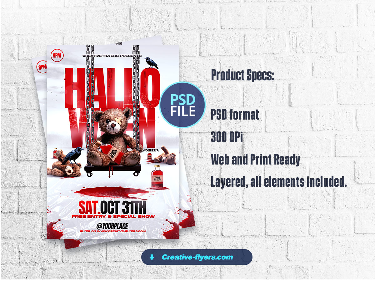 Halloween-themed event poster with a striking and eerie design. The layout features a central image of a teddy bear with a stitched eye, sitting on a blood-stained swing. Surrounding the bear are smaller teddy bears, some with missing limbs, and bottles labeled ‘True Blood.’ The background is a gradient of light to dark, enhancing the spooky atmosphere. The text ‘HALLOWEEN’ is prominently displayed in large, bold red and white letters at the top, with a crow perched on the ‘H.’ The overall color scheme is dominated by red, black, and white, contributing to the chilling theme.