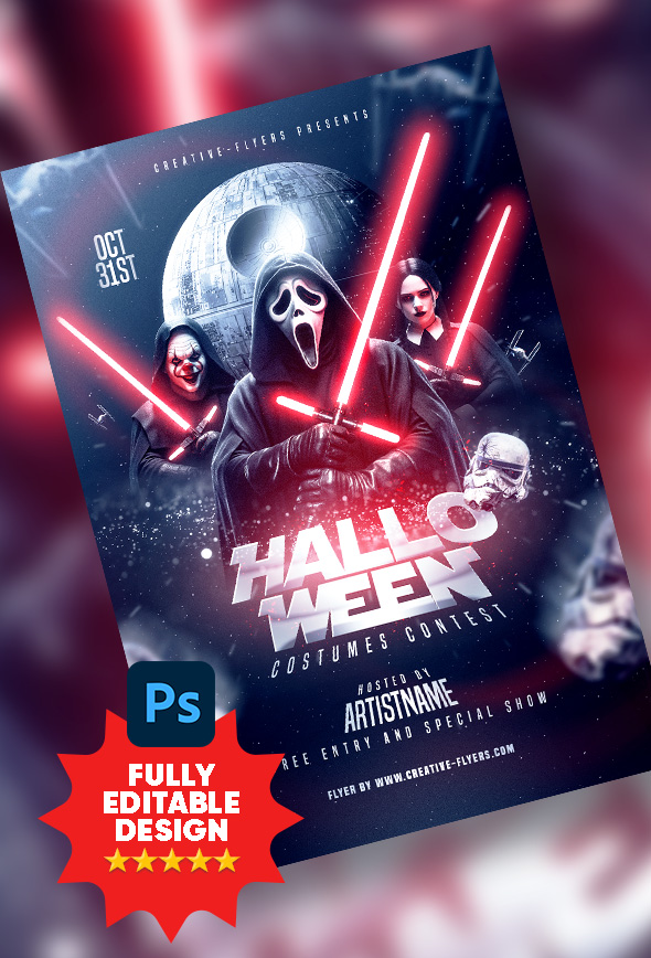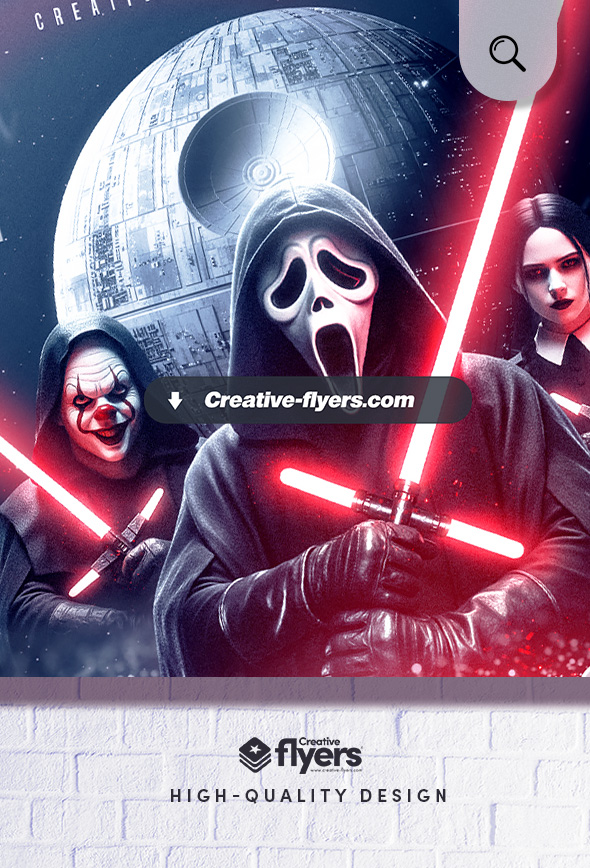 This artwork blends popular horror imagery with sci-fi composition techniques to create a cinematic Halloween vibe. The characters were arranged in a dramatic triangular formation, symbolizing strength and unity. Red lighting effects, mist overlays, and metallic typography complete the illusion of a dark space opera Halloween adventure.