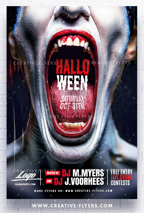 Halloween-themed event flyer with a dark and eerie design. The layout features a close-up of a person’s face with pale skin and an open mouth, creating a surreal and unsettling effect. The text ‘HALLOWEEN’ is prominently displayed in bold, red. The overall color scheme is dark with red and white accents, enhancing the spooky theme.