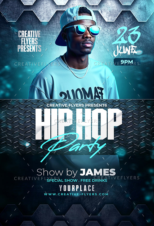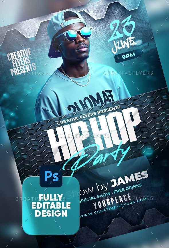 Created in Photoshop, this hip hop flyer mixes urban visuals and digital depth. The metal plate background enhances the raw, street vibe, while glowing accents and bold fonts give it an energetic edge. The modelโs style complements the party theme, and the text layout ensures readability with visual punch. Perfect for promoting a dynamic nightlife event.